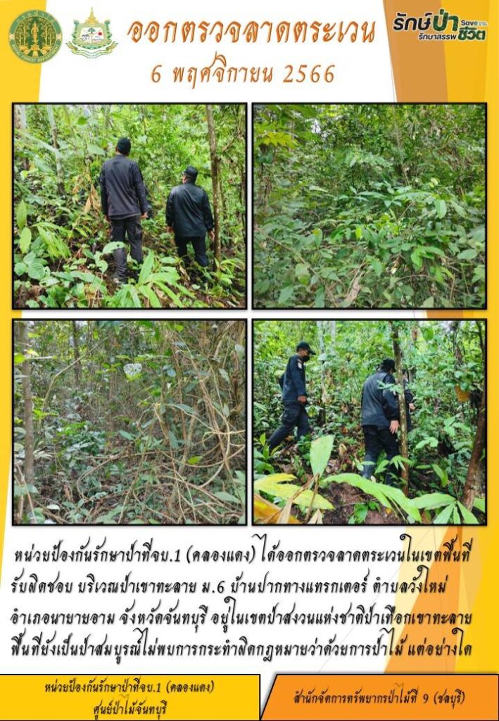 หน่วยป้องกันรักษาป่าที่ จบ.1 (คลองแดง) ได้ออกตรวจลาดตระเวนในเขตพื้นที่รับผิดชอบ บริเวณป่าเขาทะลาย หมู่ที่ 6 บ้านปากทางแทรกเตอร์ ตำบลวังใหม่ อำเภอนายายอาม จังหวัดจันทบุรี อยู่ในเขตป่าสงวนแห่งชาติป่าเทือกเขาทะลาย พื้นที่ยังเป็นป่าสมบูรณ์ ไม่พบการกระทำผิดกฎหมายว่าด้วยการป่าไม้แต่อย่างใด