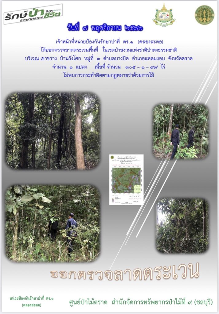 เจ้าหน้าหน่วยป้องกันรักษาป่าที่ ตร.1 (คลองสะตอ) ได้ออกตรวจลาดตระเวนพื้นที่ ในเขตป่าสงวนแห่งชาติป่าดงธรรมชาติ บริเวณเขาขวาง บ้านวังโศก หมู่ที่ 3 ตำบลบางปิด อำเภอแหลมงอบ จังหวัดตราด จำนวน 1 แปลง เนื้อที่ 305-1-97 ไร่ ไม่พบการกระทำผิดตามกฎหมายว่าด้วยการป่าไม้