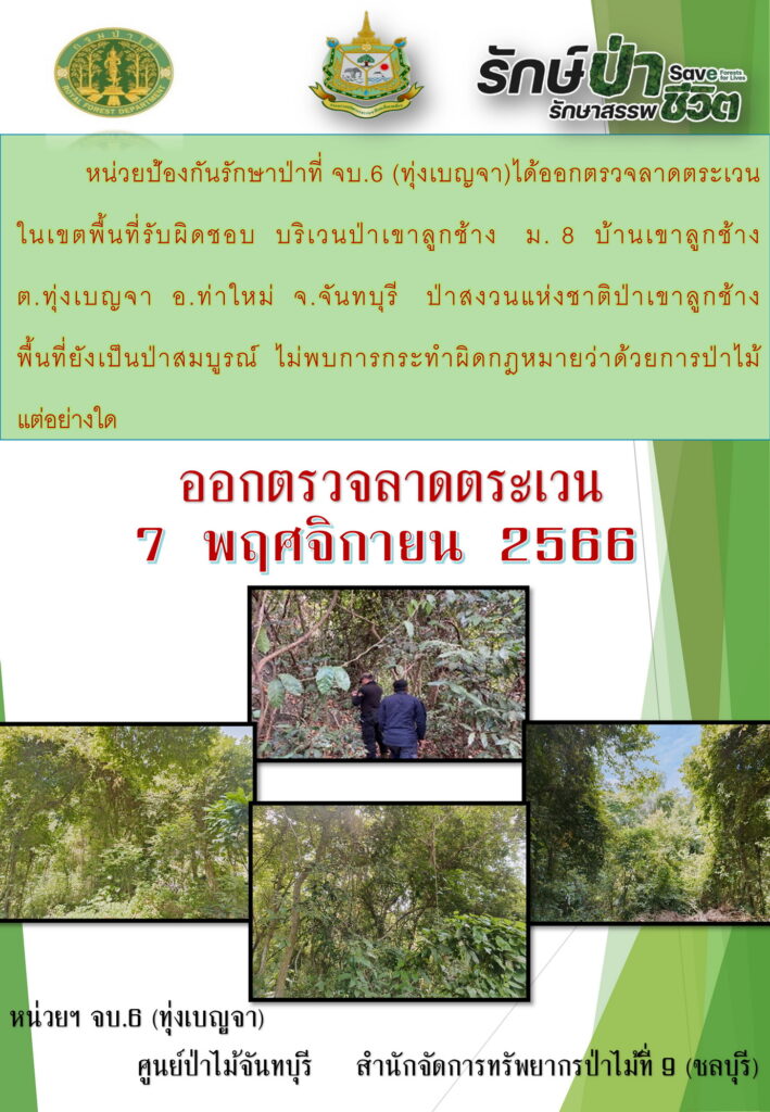 หน่วยป้องกันรักษาป่าที่ จบ.6 (ทุ่งเบญจา) ได้ออกตรวจลาดตระเวนในเขตพื้นที่รับผิดชอบ บริเวณป่าเขาลูกช้าง หมู่ที่ 8 บ้านเขาลูกช้าง ตำบลทุ่งเบญจา อำเภอท่าใหม่ จังหวัดจันทบุรี อยู่ในเขตป่าสงวนแห่งชาติป่าเขาลูกช้าง พื้นที่ยังเป็นป่าสมบูรณ์ ไม่พบการกระทำผิดกฎหมายว่าด้วยการป่าไม้แต่อย่างใด