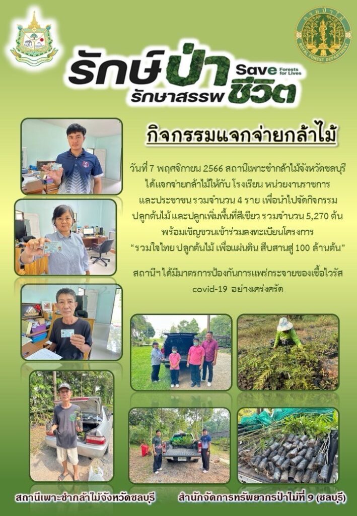 สถานีเพาะชำกล้าไม้จังหวัดชลบุรี ได้แจกจ่ายกล้าไม้ให้กับโรงเรียน หน่วยงานราชการ และประชาชน 4 ราย เพื่อนำไปจัดกจิกรรมปลูกต้นไม้ และปลูกเพิ่มพื้นที่สีเขียว รวมจำนวน 5,270 ต้น พร้อมเชิญชวนเข้าร่วมลงทะเบียนโครงการ “รวมใจไทย ปลูกต้นไม้ เพื่อแผ่นดิน สืบสานสู่ 100 ล้านต้น”