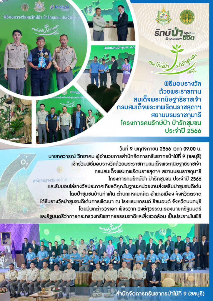 เวลา 09.00 น. นายทศวารณ์ วิทยาคม ผู้อำนวยการสำนักจัดการทรัพยากรป่าไม้ที่ 9 (ชลบุรี) เข้าร่วมพิธีมอบรางวัลถ้วยพระราชทานสมเด็จพระกนิษฐาธิราชเจ้า กรมสมเด็จพระเทพรัตนราชสุดาฯ สยามบรมราชกุมารี โครงการคนรักษ์ป่า ป่ารักชุมชน ประจำปี 2566 และรับมอบโล่รางวัลประกาศเกียรติคุณในฐานะหน่วยงานส่งเสริมป่าชุมชนดีเด่น โดยป่าชุมชนบ้านท่าเส้น ตำบลแหลมกลัด อำเภอเมือง จังหวัดตราด ได้รับรางวัลป่าชุมชนดีเด่นการพัฒนา ณ โรงแรมแกรนด์ ริชมอนด์ จังหวัดนนทบุรี โดยมีพลตำรวจเอก พัชรวาท วงษ์สุวรรณ รองนายกรัฐมนตรีและรัฐมนตรีว่าการกระทรวงทรัพยากรธรรมชาติและสิ่งแวดล้อม เป็นประธานในพิธี