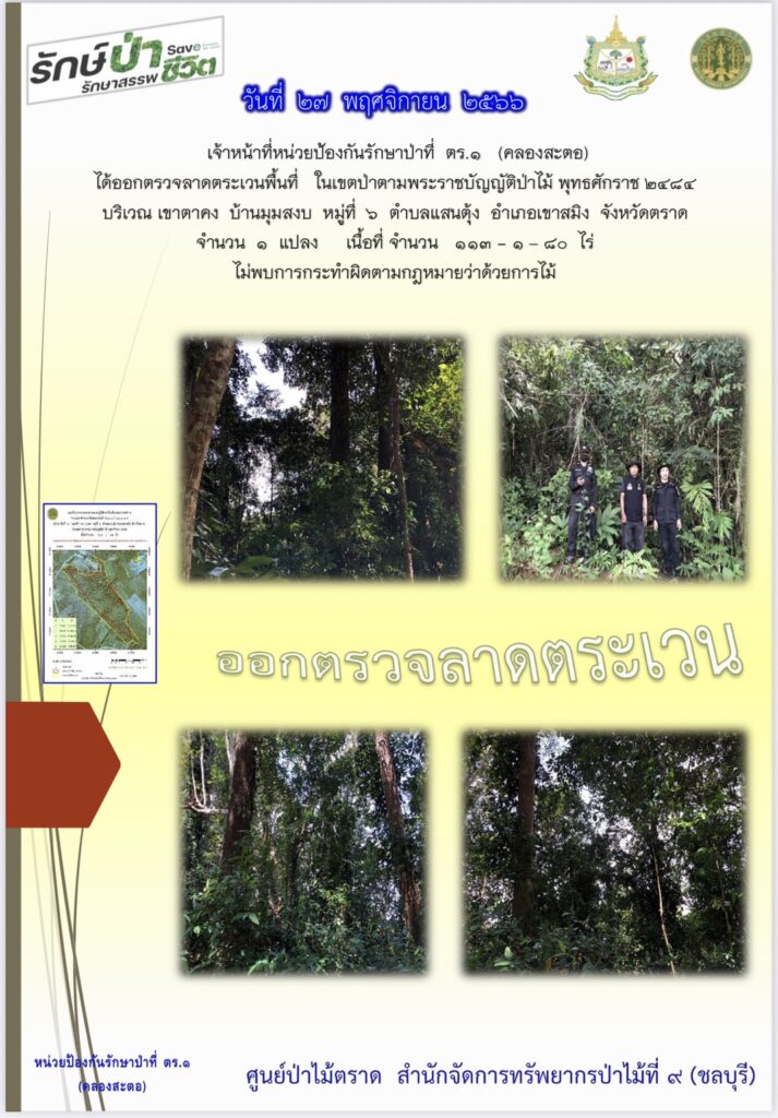 เจ้าหน้าที่หน่วยป้องกันรักษาป่าที่ ตร.1 (คลองสะตอ) ได้ออกตรวจลาดตระเวนพื้นที่ ในเขตป่าตามพระราชบัญญัติป่าไม้ พุทธศักราช 2484 บริเวณเขาตาคง บ้านมุมสงบ หมู่ที่ 6 ตำบลแสนตุ้ง อำเภอเขาสมิง จังหวัดตราด จำนวน 1 แปลง เนื้อที่ 113-1-80 ไร่ ไม่พบการกระทำผิดตามกฎหมายว่าด้วยการป่าไม้