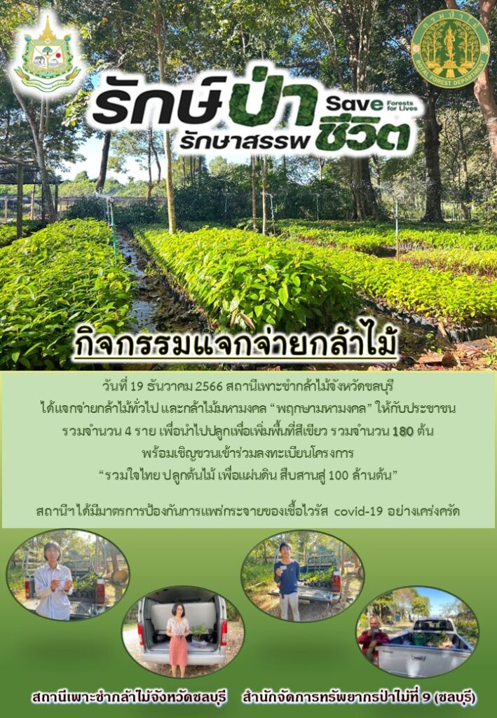 สถานีเพาะชำกล้าไม้จังหวัดชลบุรี ได้แจกจ่ายกล้าไม้ทั่วไปและกล้าไม้มงคล “พฤกษามหามงคล” ให้กับประชาชน 4 รายเพื่อนำไปปลูกเพิ่มพื้นที่สีเขียว รวมจำนวน 180 ต้น พร้อมเชิญชวนเข้าร่วมลงทะเบียนโครงการ “รวมใจไทย ปลูกต้นไม้ เพื่อแผ่นดิน สืบสานสู่ 100 ล้านต้น”