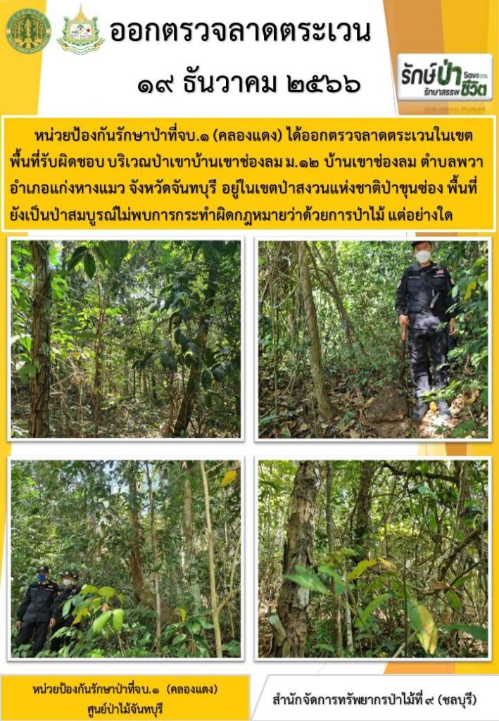 หน่วยป้องกันรักษาป่าที่ จบ.1 (คลองแดง) ได้ออกตรวจลาดตระเวนในเขตพื้นที่รับผิดชอบ บริเวณป่าเขาบ้านเขาช่องลม หมู่ที่ 12 บ้านเขาช่องลม ตำบลพวา อำเภอแก่งหางแมว จังหวัดจันทบุรี อยู่ในเขตป่าสงวนแห่งชาติป่าขุนซ่อง พื้นที่ยังเป็นป่าสมบูรณ์ ไม่พบการกระทำผิดกฎหมายว่าด้วยการป่าไม้แต่อย่างใด