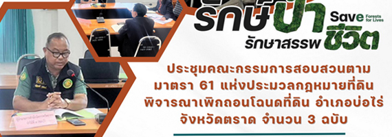 วันที่ 27 ธันวาคม 2566 เวลา 09.30 น. นายปฏิยุทธ์ บูรพัฒน์ ผู้อำนวยการศูนย์ป่าไม้ตราด แทนผู้อำนวยการสำนักจัดการทรัพยากรป่าไม้ที่ 9 (ชลบุรี) และนายอภิวัฒน์ สุวรรณฤกษ์ นายช่างสำรวจปฏิบัติงาน เข้าร่วมประชุมคณะกรรมการสอบสวนตามมาตรา 61 แห่งประมวลกฎหมายที่ดิน ครั้งที่ 3/2566 เพื่อพิจารณาว่าโฉนดที่ดิน จำนวน 3 โฉนด คือ โฉนดที่ดิน เลขที่ 5085, 5086 และ 5087 ตำบลบ่อพลอย อำเภอบ่อไร่ จังหวัดตราด ออกไปโดยชอบหรือไม่ชอบด้วยกฎหมาย ณ ห้องประชุมที่ว่าการอำเภอเขาสมิง โดยมีนางสาวริริวิภา พงษ์ธานี เจ้าพนักงานที่ดินจังหวัดตราด สาขาเขาสมิง เป็นประธาน ที่ประชุมมีมติเป็นเอกฉันท์ “เห็นควรเพิกถอนโฉนดที่ดินทั้ง 3 ฉบับ”