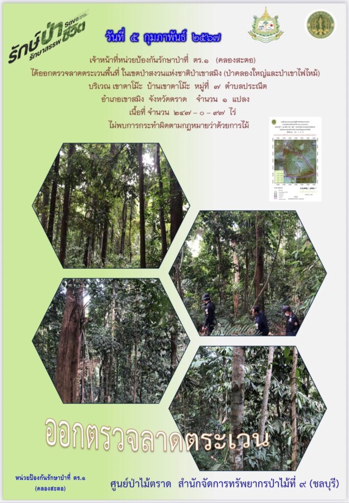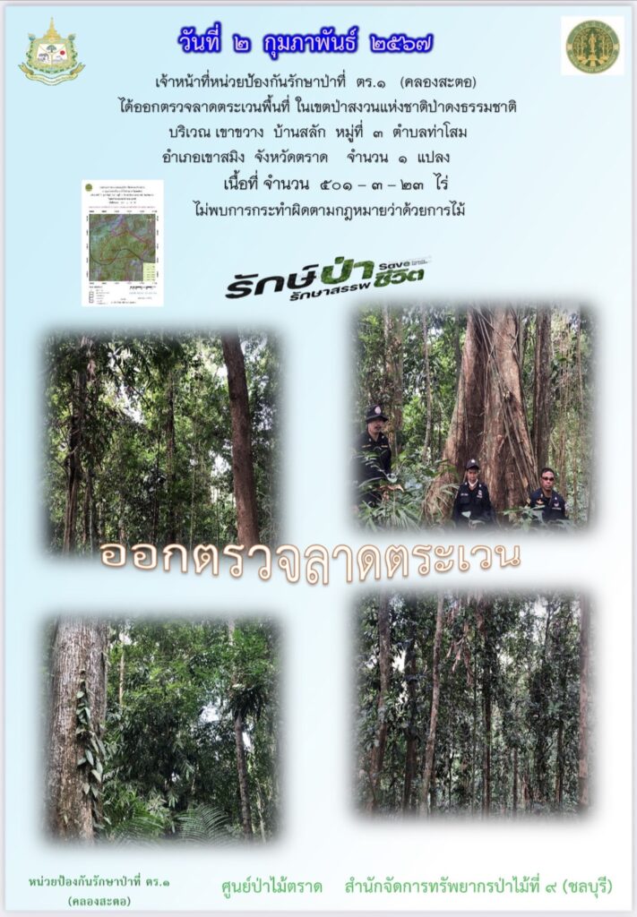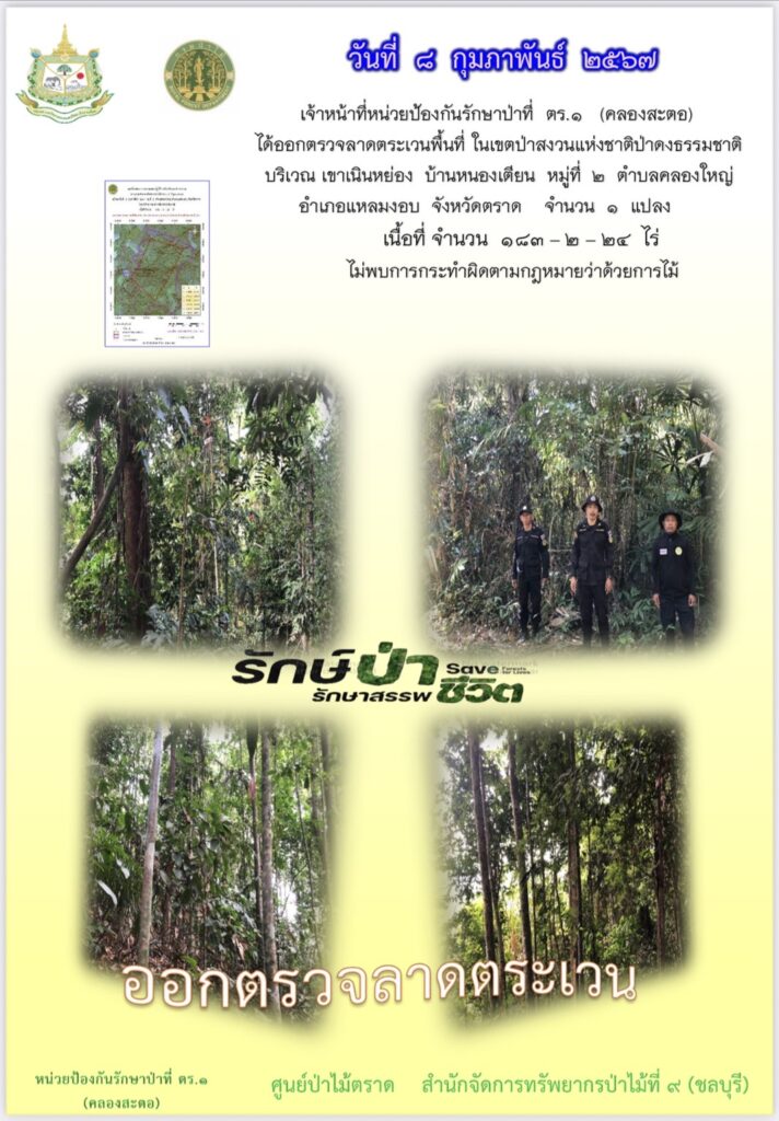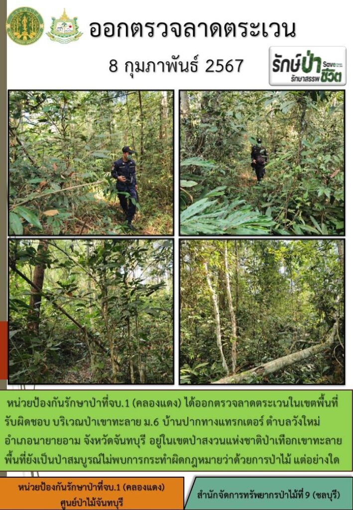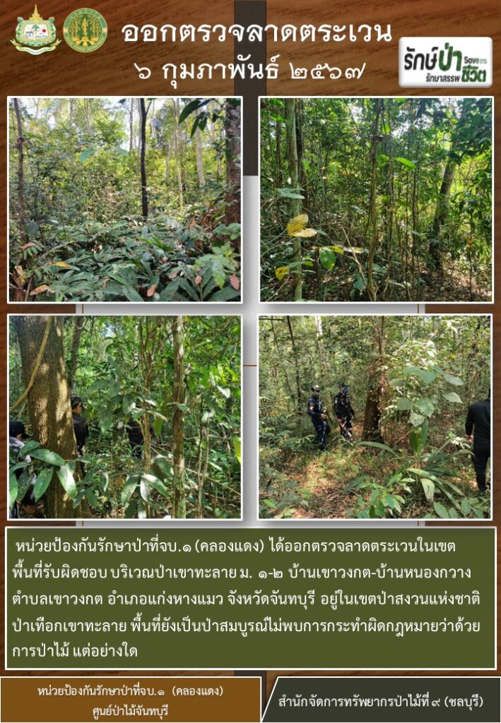 หน่วยป้องกันรักษาป่าที่ จบ.1 (คลองแดง) ออกตรวจลาดตระเวนในเขตป่าสงวนแห่งชาติป่าขุนซ่อง บริเวณป่าเขาคลองเรือแตก บ้านวังอีแอ่น ตำบลพวา อำเภอแก่งหางแมว จังหวัดจันทบุรี