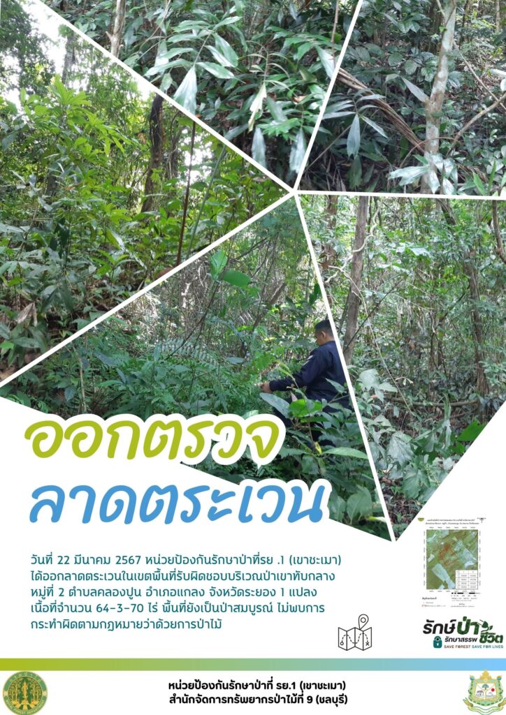 หน่วยป้องกันรักษาป่าที่ รย.1 (เขาชะเมา) ได้ออกตรวจลาดตระเวนในเขตพื้นที่รับผิดชอบ บริเวณป่าเขาทับกลาง หมู่ที่ 2 ตำบลคลองปูน อำเภอแกลง จังหวัดระยอง จำนวน 1 แปลง เนื้อที่ 64-3-70 ไร่ พื้นที่ยังเป็นป่าสมบูรณ์ ไม่พบการกระทำผิดตามกฎหมายว่าด้วยการป่าไม้