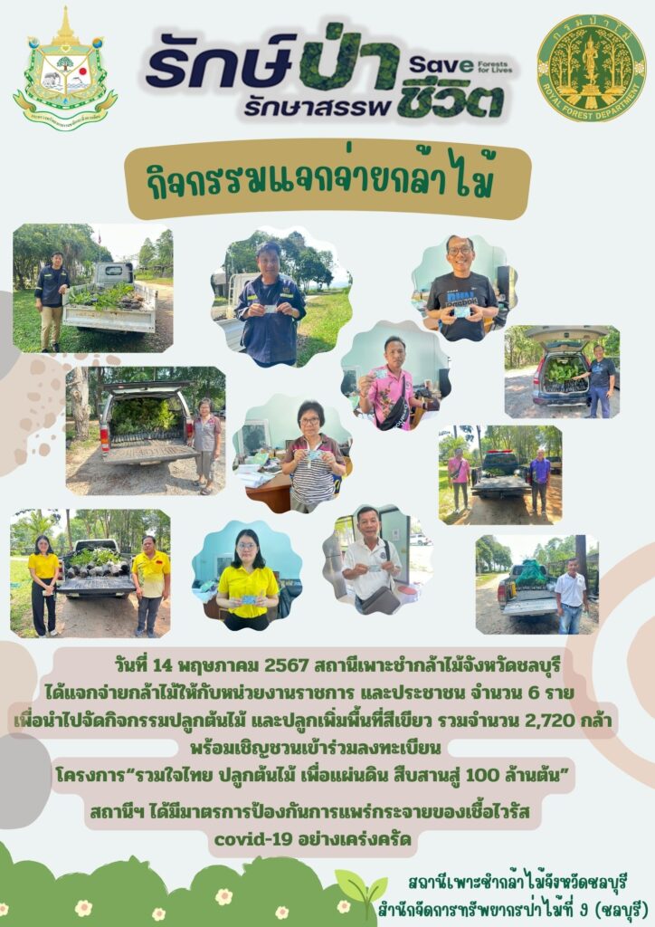 สถานีเพาะชำกล้าไม้จังหวัดชลบุรี ได้แจกจ่ายกล้าไม้ให้กับหน่วยงานราชการ และประชาชน 6 ราย เพื่อนำไปจัดกิจกรรมปลูกต้นไม้ และปลูกเพิ่มพื้นที่สีเขียว รวมจำนวน 2,420 กล้า พร้อมเชิญชวนเข้าร่วมลงทะเบียนโครงการ “รวมใจไทย ปลูกต้นไม้ เพื่อแผ่นดิน สืบสานสู่ 100 ล้านต้น”