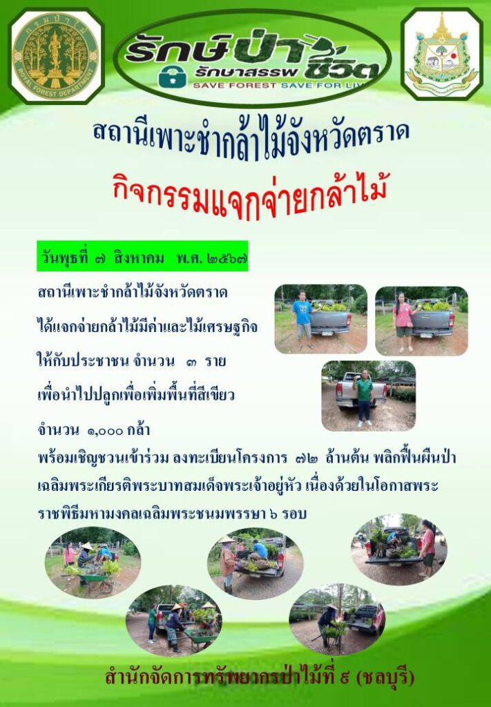 สถานีเพาะชำกล้าไม้จังหวัตราด ได้แจกจ่ายกล้าไม้มีค่าและไม้เศรษฐกิจให้กับประชาชน 3 ราย เพื่อนำไปปลูกเพิ่มพื้นที่สีเขียว รวมจำนวน 1,000 กล้า พร้อมเชิญชวนร่วมลงทะเบียนโครงการ 72 ล้าต้น พลิกฟื้นผืนป่า เฉลิมพระเกียรติพระบาทสมเด็จพระเจ้าอยู่หัว เนื่องในโอกาสพระราชพิธีมหามงคลเฉลิมพระชนมพรรษา 6 รอบ