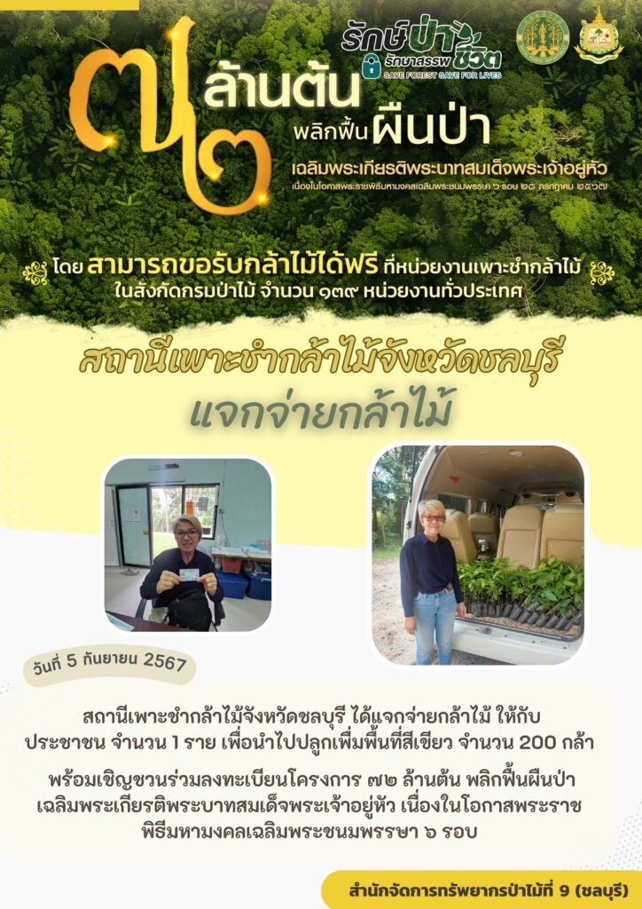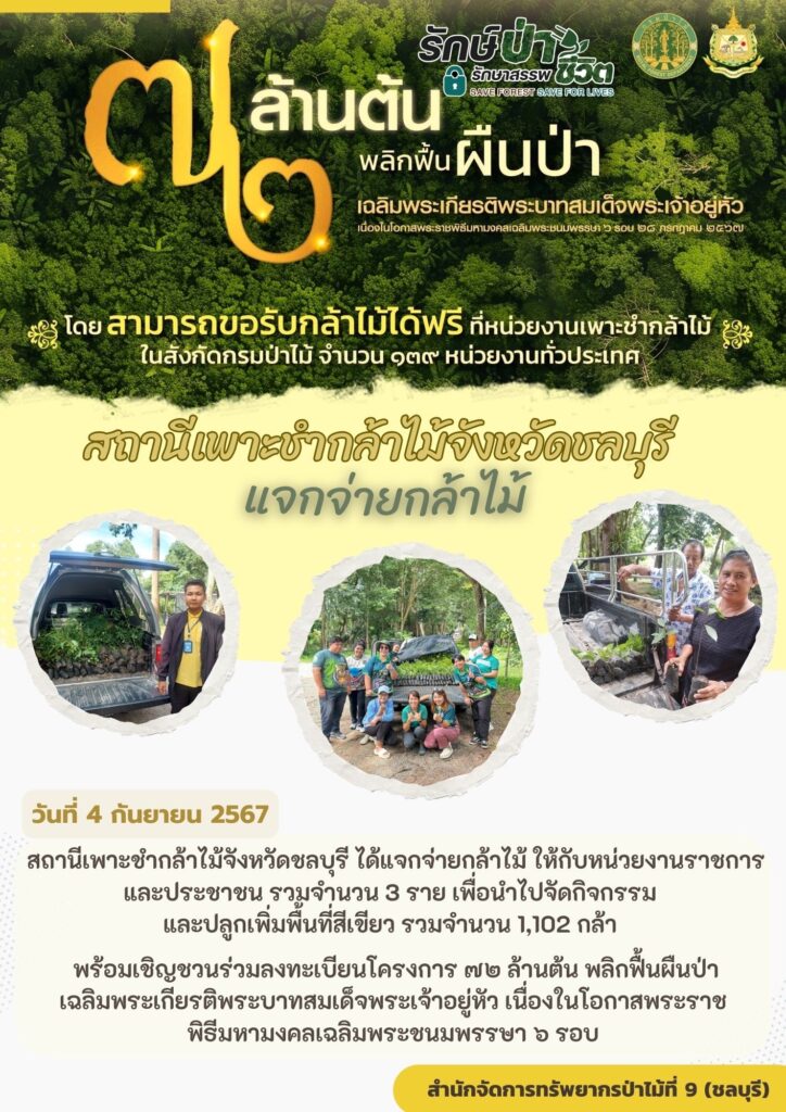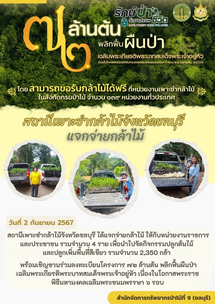 สถานีเพาะชำกล้าจังหวัดชลบุรี แจกจ่ายกล้าไม้ให้กับหน่วยงานราชการ และประชาชน 10 ราย เพื่อนำไปจัดกิจกรรมปลูกต้นไม้เฉลิมพระเกียรติ และปลูกเพิ่มพื้นที่สีเขียว รวมจำนวน 7,485 กล้า
