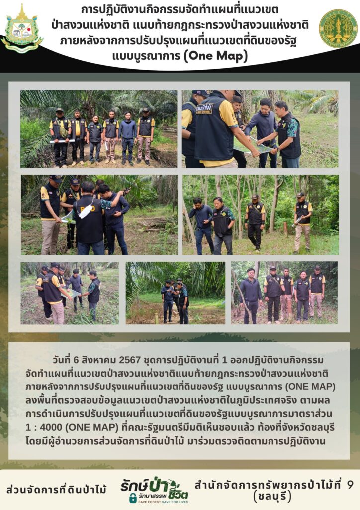 ชุดปฏิบัติงานที่ 1 ออกปฏิบัติงานกิจกรรมจัดทำแผนที่แนวเขตป่าสงวนแห่งชาติแนบท้ายกฎกระทรวงป่าสงวนแห่งชาติ ภายหลังจากการปรับปรุงแผนที่แนวเขตที่ดินของรัฐ แบบบูรณาการ (ONE MAP) ลงพื้นที่ตรวจสอบข้อมูลแนวเขตป่าสงวนแห่งชาติในภูมิประเทศจริง ตามผลการดำเนินการปรับปรุงแผนที่แนวเขตที่ดินของรัฐแบบบูรณาการมาตราส่วน 1:4000 (ONE MAP) ที่คณะรัฐมนตรีมีมติเห็นชอบแล้ว ท้องที่จังหวัดชลบุรี โดยมีผู้อำนวยการส่วนจัดการที่ดินป่าไม้ มาร่วมตรวจติดตามการปฏิบัติงาน