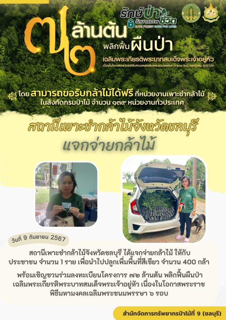 สถานีเพาะชำกล้าไม้จังหวัดชลบุรี ได้แจกจ่ายกล้าไม้ให้กับประชาชน 1 ราย เพื่อนำไปปลูกเพิ่มพื้นที่สีเขียว จำนวน 400 กล้า พร้อมเชิญชวนร่วมลงทะเบียนโครงการ 72 ล้าต้น พลิกฟื้นผืนป่า เฉลิมพระเกียรติพระบาทสมเด็จพระเจ้าอยู่หัว เนื่องในโอกาสพระราชพิธีมหามงคลเฉลิมพระชนมพรรษา 6 รอบ