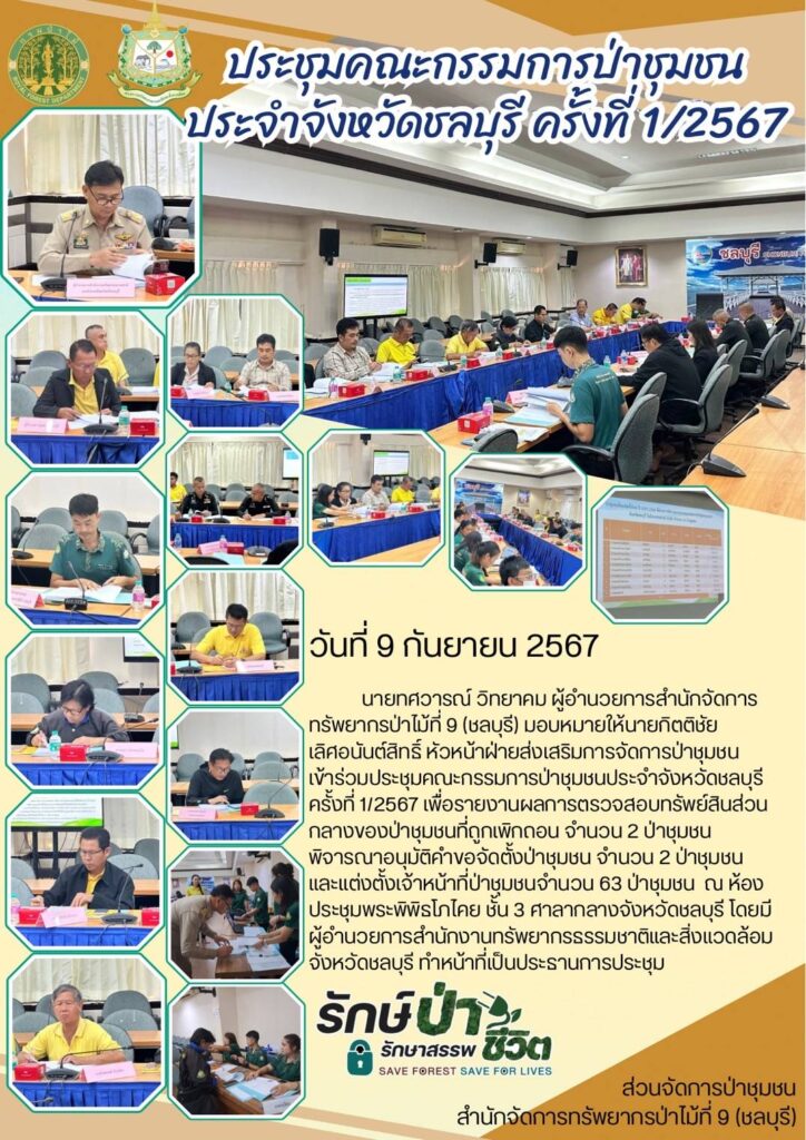 นายทศวารณ์ วิทยาคม ผู้อำนวยการสำนักจัดการทรัพยากรป่าไม้ที่ 9 (ชลบุรี) มอบหมายนายกิตติชัย เลิศอนันต์สิทธิ์ หัวหน้าฝ่ายส่งเสริมการจัดการป่าชุมชน เข้าร่วมประชุมคณะกรรมการป่าชุมชนประจำจังหวัดชลบุรี ครั้งที่ 1/2567 เพื่อรายงานผลการตรวจสอบทรัพย์สินส่วนกลางของป่าชุมชนที่ถูกเพิกถอน จำนวน 2 ป่าชุมชน พิจารณาอนุมัติคำขอจัดตั้งป่าชุมชน จำนวน 2 ป่าชุมชน และแต่งตั้งเจ้าหน้าที่ป่าชุมชน จำนวน 63 ป่าชุมชน ณ ห้องประชุมพระพิพิธโภไคย ชั้น 3 ศาลากลางจังหวัดชลบุรี โดยมีผู้อำนวยการสำนักงานทรัพยากรธรรมชาติและสิ่งแวดล้อมจังหวัดชลบุรี ทำหน้าที่เป็นประธานการประชุม