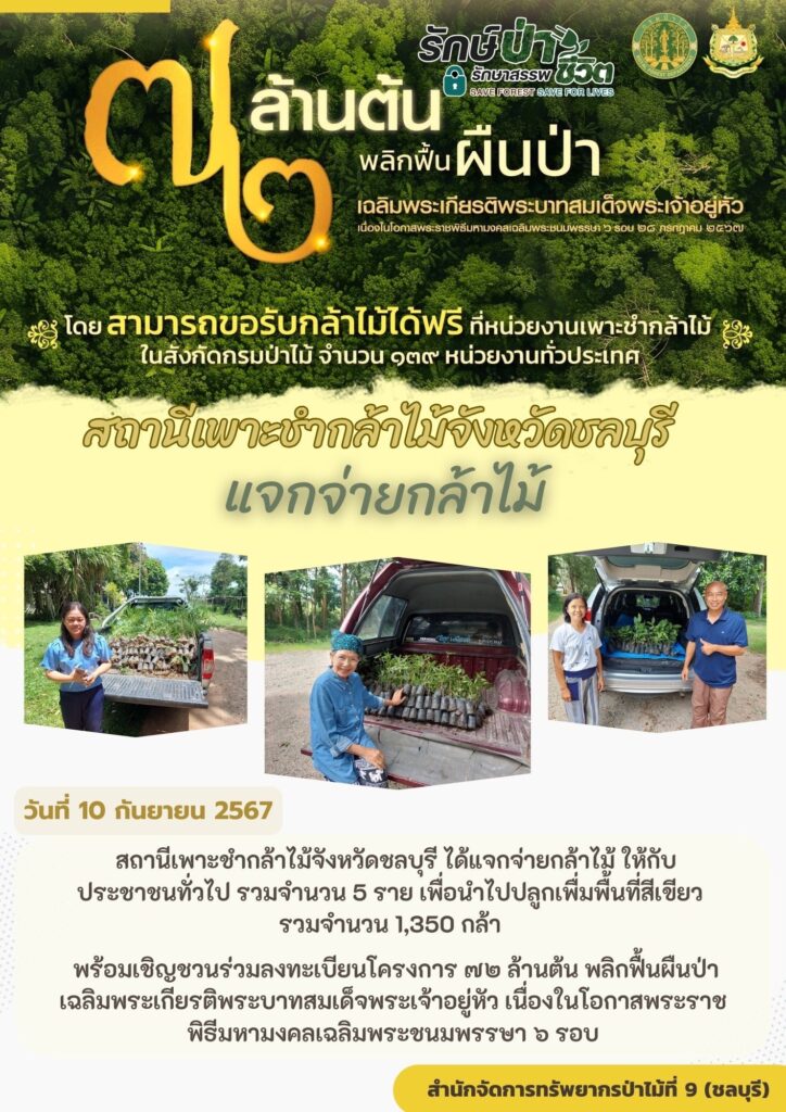 สถานีเพาะชำกล้าไม้จังหวัดชลบุรี ได้แจกจ่ายกล้าไม้ให้กับประชาชนทั่วไป 5 ราย เพื่อนำไปปลูกเพิ่มพื้นที่สีเขียว รวมจำนวน 1,350 กล้า พร้อมเชิญชวนร่วมลงทะเบียนโครงการ 72 ล้าต้น พลิกฟื้นผืนป่า เฉลิมพระเกียรติพระบาทสมเด็จพระเจ้าอยู่หัว เนื่องในโอกาสพระราชพิธีมหามงคลเฉลิมพระชนมพรรษา 6 รอบ
