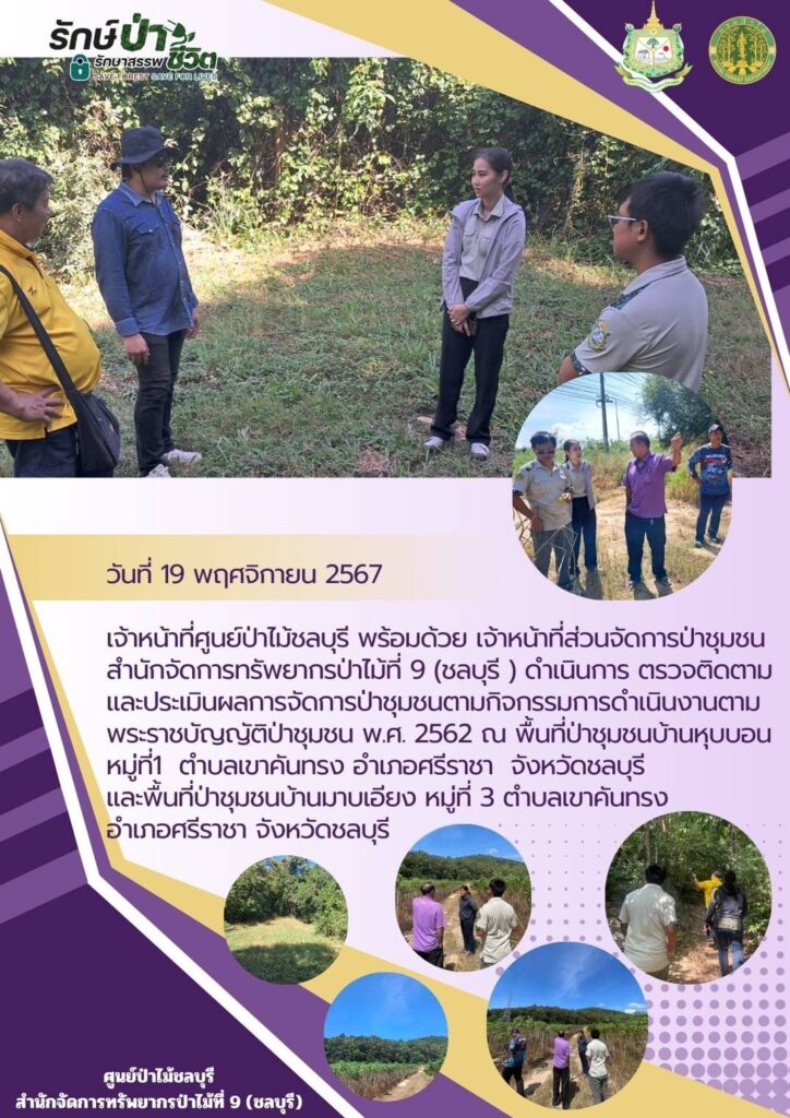 เจ้าหน้าที่ศูนย์ป่าไม้ชลบุรี พร้อมด้วย เจ้าหน้าที่ส่วนจัดการป่าชุมชน สำนักจัดการทรัพยากรป่าไม้ที่ 9 (ชลบุรี) ดำเนินการตรวจติดตามและประเมินผลการจัดการป่าชุมชนตามกิจกรรมการดำเนินงานตามพระราชบัญญัติป่าชุมชน พ.ศ. 2562 ณ พื้นที่ป่าชุมชนบ้านหุบบอน หมู่ที่ 1 และพื้นที่ป่าชุมชนบ้านมาบเอียง หมู่ที่ 3 ตำบลเขาคันทรง อำเภอศรีราชา จังหวัดชลบุรี