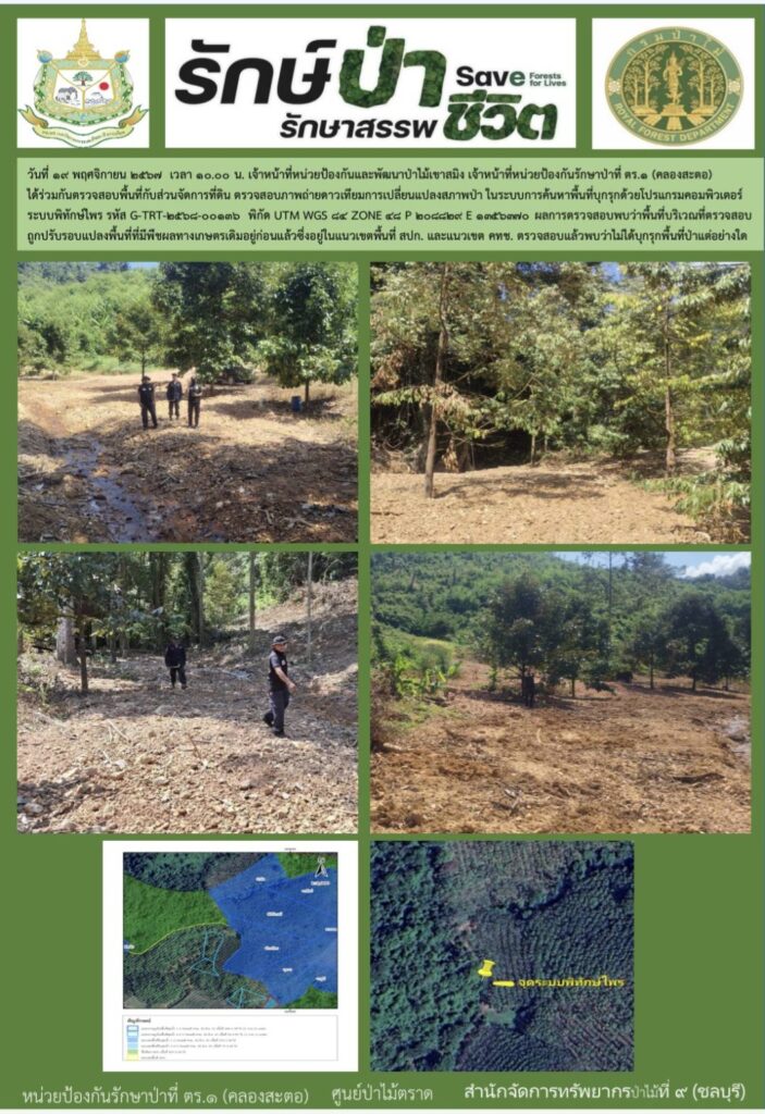 เจ้าหน้าที่หน่วยป้องกันและพัฒนาป่าไม้เขาสมิง เจ้าหน้าที่หน่วยป้องกันรักษาป่าที่ ตร.1 (คลองสะตอ) ได้ร่วมกันตรวจสอบพื้นที่กันส่วนจัดการที่ดินป่าไม้ ตรวจสอบภาพถ่ายดาวเทียมการเปลี่ยนแปลงสภาพป่า ในระบบการค้นหาพื้นที่บุกรุกด้วยโปรแกรมคอมพิวเตอร์ ระบบพิทักษ์ไพร รหัส G-TRT-2568-00136 พิกัด UTM WGS 84 Zone 48 P 208829 E 1356370 ผลการตรวจสอบพบว่าพื้นที่บริเวณที่ตรวจสอบถูกปรับรอบแปลง พื้นที่มีพืชผลทางการเกษตรเดิมอยู่ก่อนแล้วซึ่งอยู่ในแนวเขตพื้นที่ สปก. และแนวเขต คทช. ตรวจสอบแล้วพบว่าไม่ได้บุกรุกพื้นที่ป่าแต่อย่างใด