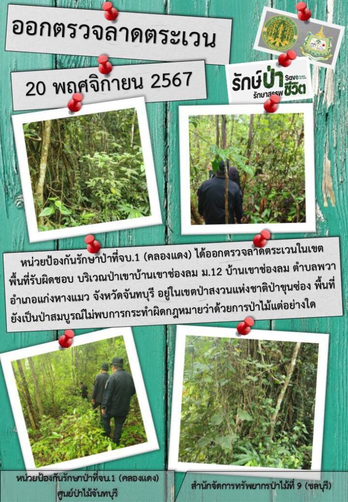 หน่วยป้องกันรักษาป่าที่ จบ.1 (คลองแดง) ได้ออกตรวจลาดตระเวนในเขตพื้นที่รับผิดชอบ บริเวณป่าเขาบ้านเขาช่องลม หมู่ที่ 12 บ้านเขาช่องลม ตำบลพวา อำเภอแกางหางแมว จังหวัดจันทบุรี อยู่ในเขตป่าสงวนแห่งชาติป่าขุนซ่อง พื้นที่ยังเป็นป่าสมบูรณ์ ไม่พบการกระทำผิดกฎหมายว่าด้วยการป่าไม้แต่อย่างใด