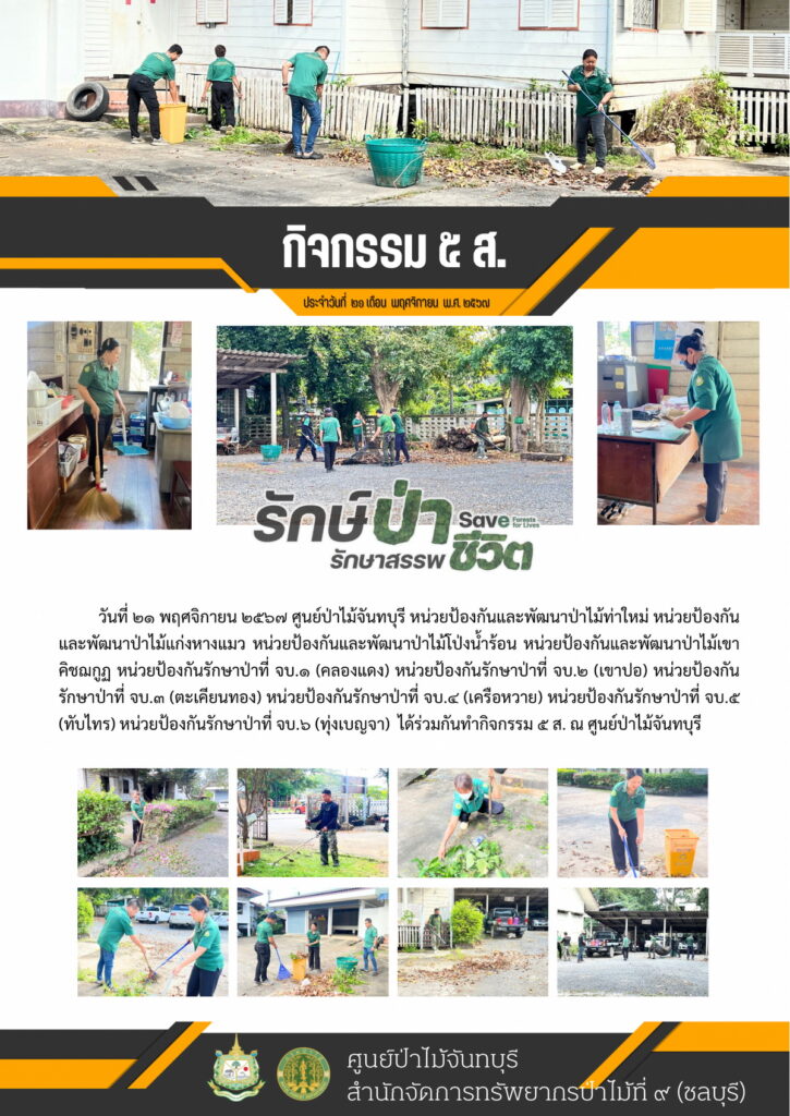 ศูนย์ป่าไม้จันทบุรี หน่วยป้องกันและพัฒนาป่าไม้ท่าใหม่ หน่วยป้องกันและพัฒนาป่าไม้แก่งหางแมว หน่วยป้องกันและพัฒนาป่าไม้โป่งน้ำร้อน หน่วยป้องกันและพัฒนาป่าไม้เขาคิชฌกูฎ หน่วยป้องกันรักษาป่ที่ จบ.1 (คลองแดง) หน่วยป้องกันรักษาป่าที่ จบ.2 (เขาปอ) หน่วยป้องกันรักษาป่าที่ จบ.3 (ตะเคียนทอง) หน่วยป้องกันรักษาป่ที่ จบ.4 (เครือหวาย) หน่วยป้องกันรักษาป่ที่ จบ.5 (ทับไทร) หน่วยป้องกันรักษาป่ที่ จบ.6 ทุ่งเบญจา) ได้ร่วมกันทำกิจกรรม 5 ส. ณ ศูนย์ป่าไม้จันทบุรี