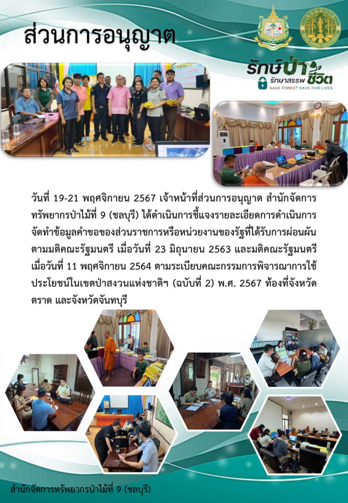 เจ้าหน้าที่ส่วนการอนุญาต สำนักจัดการทรัพยากรป่าไม้ที่ 9 (ชลบุรี) ได้ดำเนินการชี้แจงรายละเอียดการดำเนินการจัดทำข้อมูลคำขอของส่วนราชการหรือหน่วยงานของรัฐที่ได้รับการผ่อนผันตามมติคณะรัฐมนตรี เมื่อวันที่ 23 มิถุนายน 2563 และมติคณะรัฐมนตรี เมื่อวันที่ 11 พฤษภาคม 2564 ตามระเบียบคณะกรรมการพืจารณาการใช้ประโยชน์ในเขตป่าสงวนแห่งชาติฯ (ฉบับที่ 2) พ.ศ. 2567 ท้องที่จังหวัดตราด และจังหวัดจันทบุรี