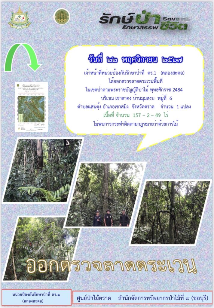 เจ้าหน้าที่หน่วยปอ้งกันรักษาป่าที่ ตร.1 (คลองสะตอ) ได้ออกตรวจลาดตระเวนพื้นที่ในเขตป่าตามพระราชบัญยัติป่าไม้ พุทธศักราช 2484 บริเวณเขาตาคง บ้านมุมสงบ หมู่ที่ 6 ตำบลแสนตุ้ง อำเภอเขาสมิง จังหวัดตราด จำนวน 1 แปลง เนื้อที่ 157-2-49 ไร่ ไพบการกระทำผิดตามกฎหมายว่าด้วยการป่าไม้