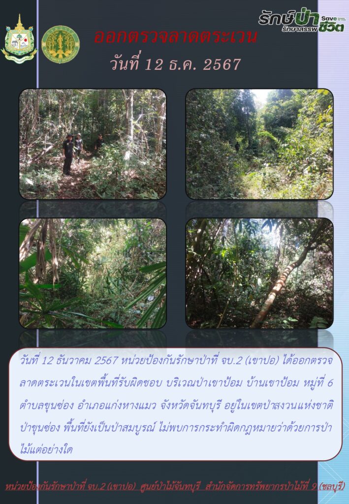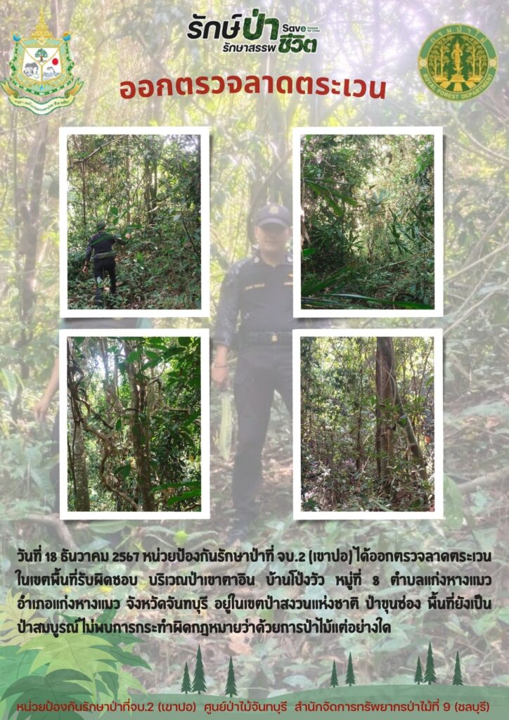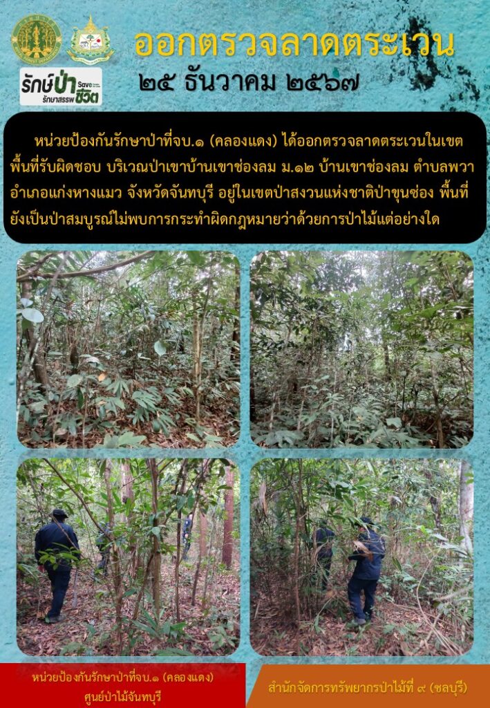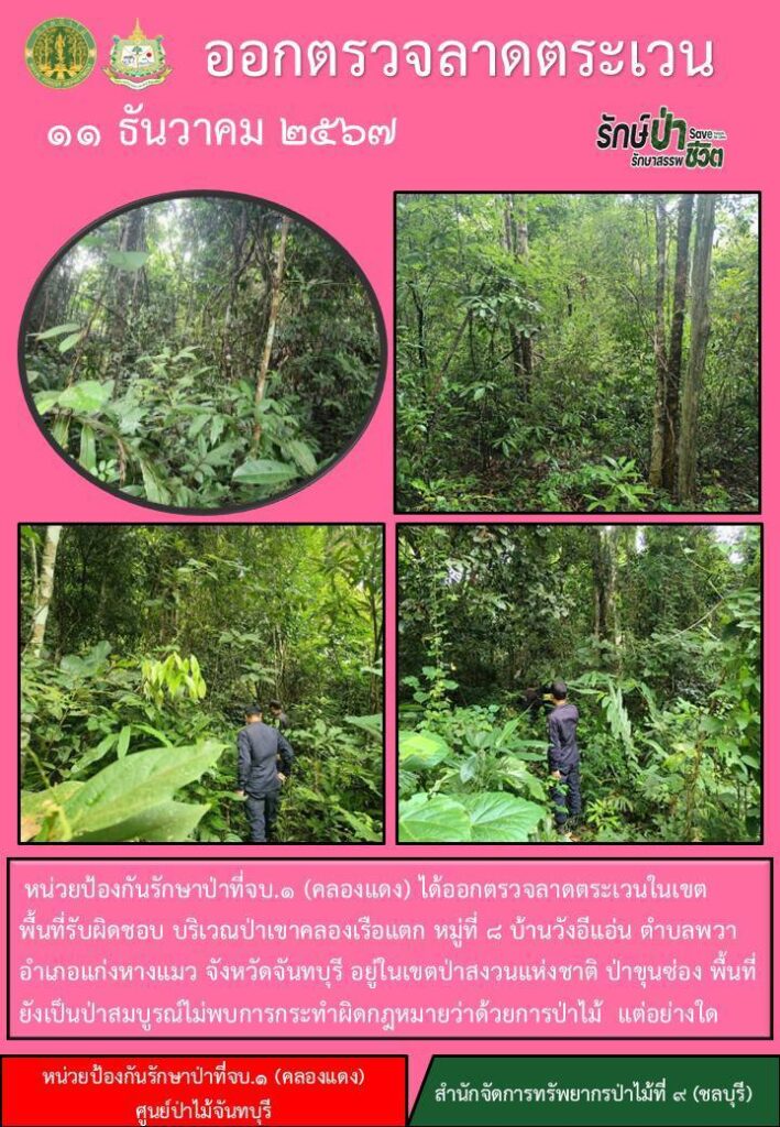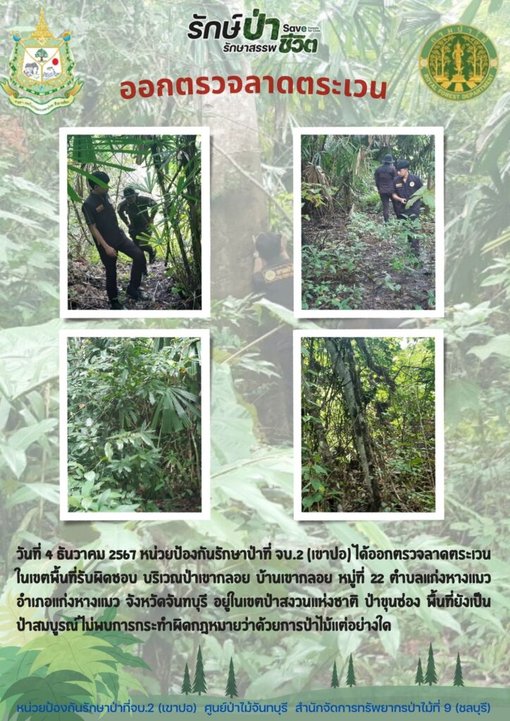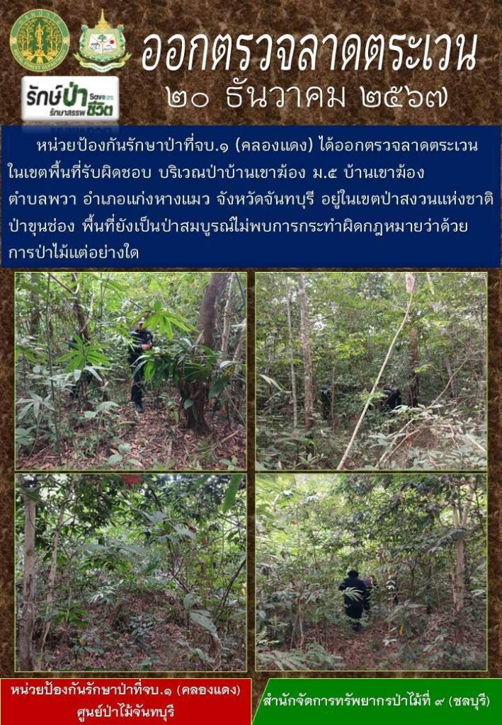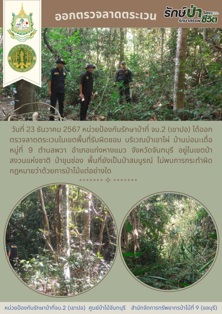 หน่วยป้องกันรักษาป่าที่ จบ.2 (เขาปอ) ออกตรวจลาดตระเวน ป่าสงวนแห่งชาติป่าขุนซ่อง บริเวณป่าเขาไผ่ บ้านบ่อมะเดื่อ หมู่ที่ 9 ตำบลพวา อำเภอแก่งหางแมว จังหวัดจันทบุรี