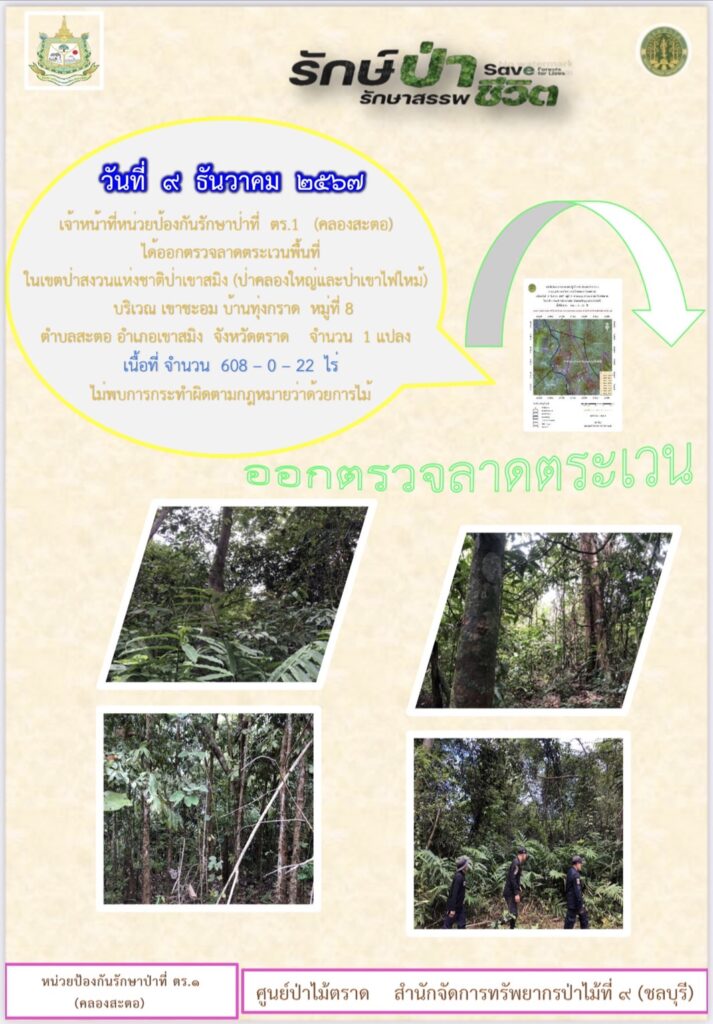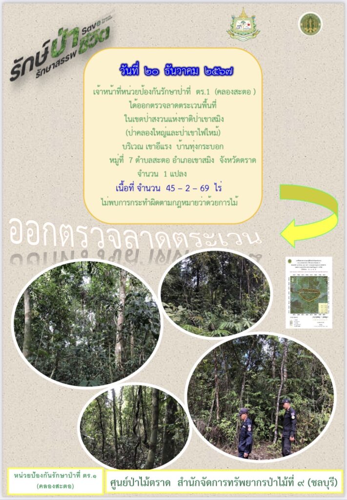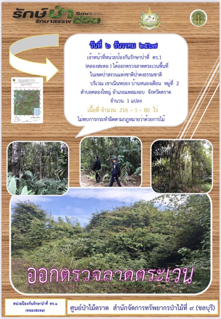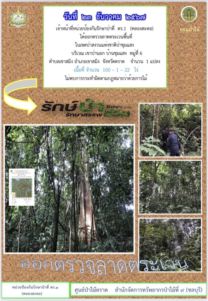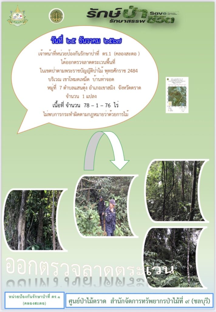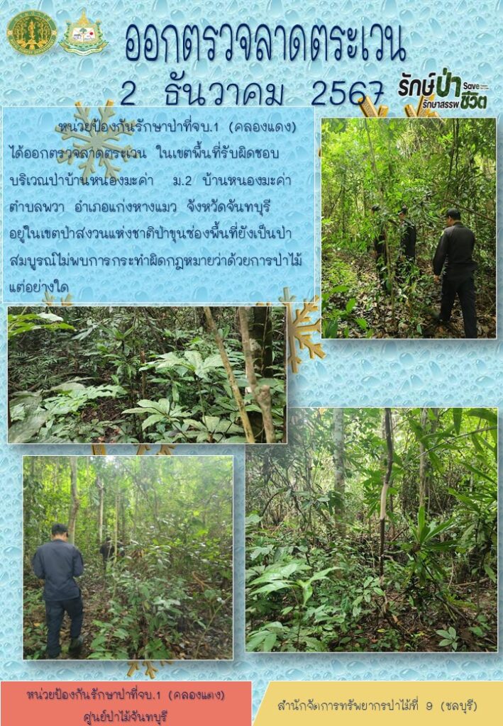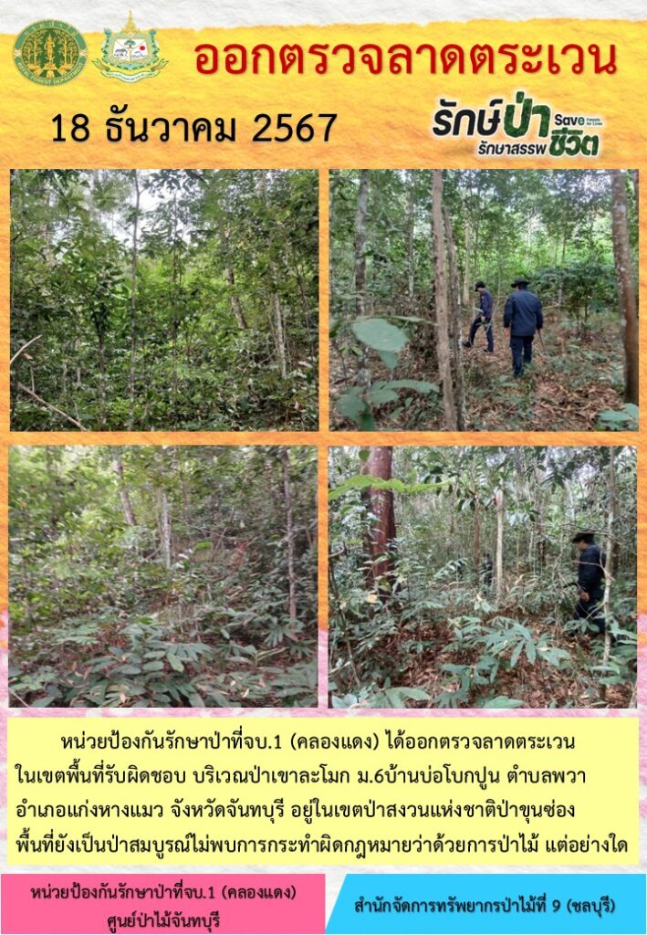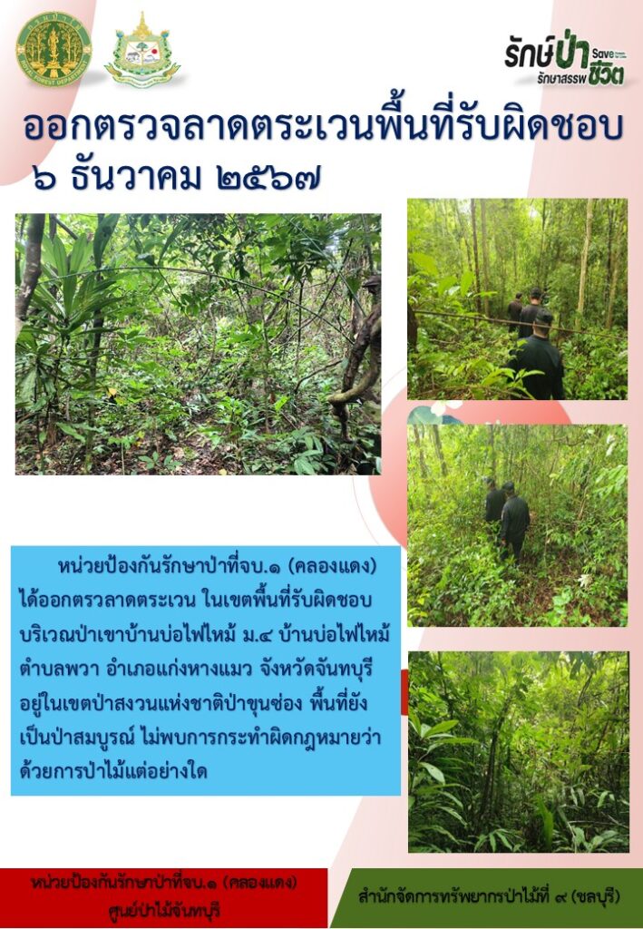 หน่วยป้องกันรักษาป่าที่ จบ.2 (เขาปอ) ออกตรวจลาดตระเวน ป่าสงวนแห่งชาติป่าขุนซ่อง บริเวณป่าเขาไผ่ บ้านบ่อมะเดื่อ หมู่ที่ 9 ตำบลพวา อำเภอแก่งหางแมว จังหวัดจันทบุรี