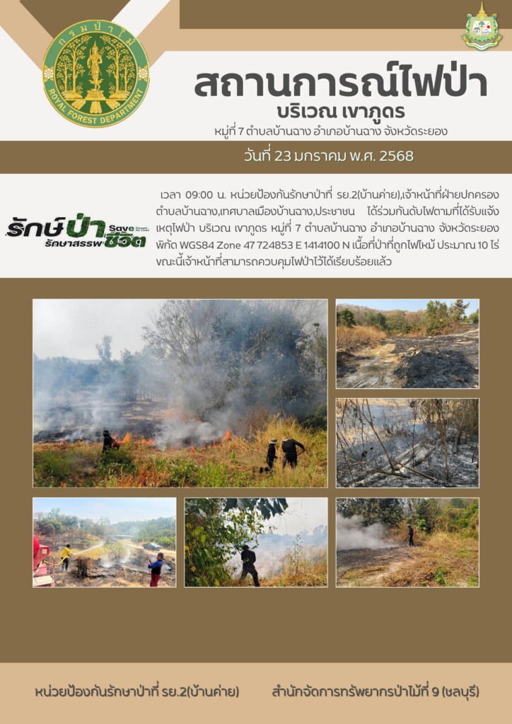 เวลา 09.00 น. หน่วยป้องกันรักษาป่าที่ รย.2 (บ้านค่าย) เจ้าหน้าที่ฝ่ายปกครองตำบลบ้านฉาง เทศบาลเมืองบ้านฉาง และประชาชน ได้ร่วมกันดับไฟตามที่ได้รับแจ้งเหตุไฟป่า บริเวณเขาภูดร หมู่ที่ 7 ตำบลบ้านฉาง อำเภอบ้านฉาง จังหวัดระยอง พิกัด WGS84 Zone 47 724853 E 1414100 N เนื้อที่ป่าที่ถูกไฟไหม้ประมาณ 10 ไร่ ขณะนี้เจ้าหน้าที่สามารถควบคุมไฟป่าไว้ได้เรียบร้อยแล้ว