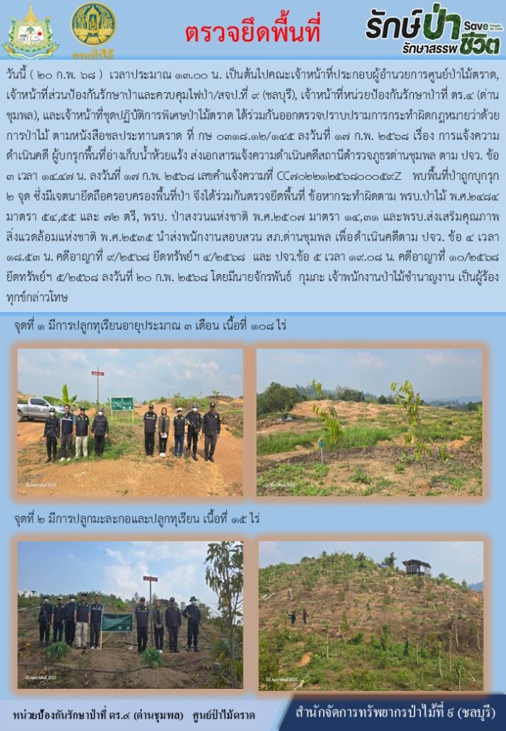 เวลาประมาณ 13.00 น. คณะเจ้าหน้าที่ประกอบด้วยผู้อำนวยการศูนย์ป่าไม้ตราด เจ้าหน้าที่ส่วนป้องกันรักษาป่าและควบคุมไฟป่า สจป.ที่ 9 (ชลบุรี) เจ้าหน้าที่หน่วยป้องกันรักษาป่าที่ ตร.4 (ด่านชุมพล) และเจ้าหน้าที่ชุดปฏิบัติการพิเศษป่าไม้ตราด ได้ร่วมกันออกตรวจปราบปรามการกระทำผิดกฎหมายว่าด้วยการป่าไม้ ตามหนังสือชลประทานตราด ที่ กษ 0318.12/145 ลงวันที่ 17 กุมภาพันธ์ 2568 เรื่อง การแจ้งความดำเนินคดี ผู้บุกรุกพื้นที่อ่างเก็บน้ำห้วยแร้ง ส่งเอกสารแจ้งความดำเนินคดีสถานีตำรวจภูธรด่านชึมพล ตาม ปจว. ข้อ 3 เวลา 14.47 น. ลงวันที่ 17 ก.พ. 2568 เลขที่คำแจ้งความ CC70221256800059Z พบพื้นที่ป่าถูกบุกรุก 2 จุด จุดที่ 1 มีการปลูกทุเรียนอายุประมาณ 3 เดือน เนื้อที่ 108 ไร่ จุดที่ 2 มีการปลูกมะละกอและปลูกทุเรียน เนื้อที่ 15 ไร่ ซึ่งมีเจตนายึดถือครอบครองพื้นที่ป่า จึงได้ร่วมกันตรวจยึดพื้นที่ ข้อหากระทำผิดตาม พรบ.ป่าไม้ พ.ศ. 2484 มาตรา 54,55 และ 72ตรี พรบ.ป่าสงวนแห่งชาติ พ.ศ. 2507 มาตรา 14,31 และ พรบ.ส่งเสริมคุณภาพส่ิงแวดล้อมแห่งชาติ พ.ศ. 2535 นำส่งพนักงานสอบสวน สภ.ด่านชุมพล เพื่อดำเนินคดีตาม ปจว. ข้อ 4 เวลา 18.53 น. คดีอาญาที่ 9/2568 ยึดทรัพย์ฯ 4/2568 และปจว. ข้อ 5 เวลา 19.08 น. คดีอาญาที่ 10/2568 ยึดทรัพย์ฯ 5/2568 ลงวันที่ 20 ก.พ. 2568 โดยมีนายจักรพันธ์ กุมภะ เจ้าพนักงานป่าไม้ชำนาญงาน เป็นผู้ร้องทุกข์กล่าวโทษ