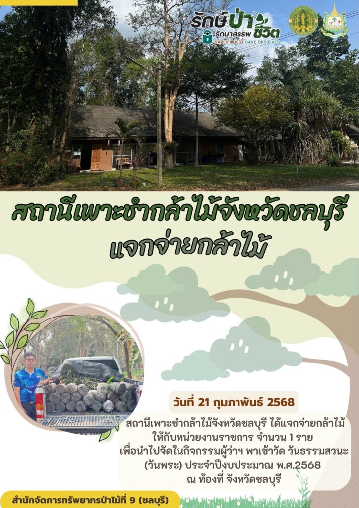 สถานีเพาะชำกล้าไม้จังหวัดชลบุรี ได้แจกจ่ายกล้าไม้ให้กับหน่วยงานราชการ วันที่ 21 กุมภาพนัธ์ 2568 สถานีเพาะชำกล้าไม้จังหวัดชลบุรี ได้แจกจ่ายกล้าไม้ให้กับหน่วยงานราชการ 1 ราย เพื่อนำไปจัดกิจกรรมผู้ว่าฯ พาเข้าวัด วันธรรมสวนะ (วันพระ) ประจำปีงบประมาณ พ.ศ. 2568 ณ ท้องที่ จังหวัดชลบุรี