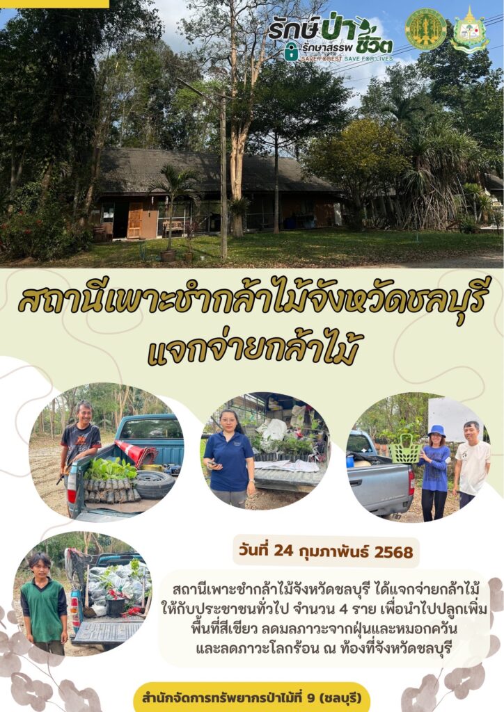 สถานีเพาะชำกล้าไม้จังหวัดชลบุรี ได้แจกจ่ายกล้าไม้ให้กับประชาชนทั่วไป 4 ราย เพื่อนำไปปลูกเพิ่มพื้นที่สีเขียว ลดมลภาวะจากฝุ่นและหมอกควัน และลดภาวะโลกร้อน ณ ท้องที่จังหวัดชลบุรี