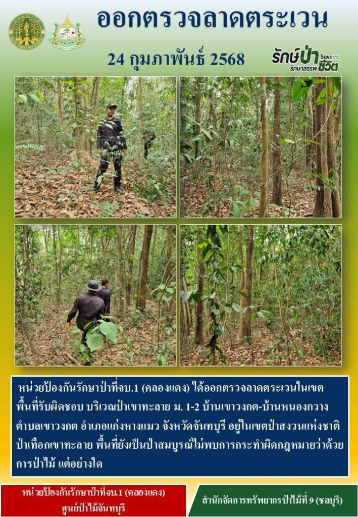 หน่วยป้องกันรักษาป่าที่ จบ.1 (คลองแดง) ได้ออกตรวจลาดตระเวนในเขตพื้นที่รับผิดชอบ บริเวณป่าเขาทะลาย หมู่ที่ 1-2 บ้านเขาวงกต-บ้านหนองกวาง ตำบลเขาวงกต อำเภอแก่งหางแมว จังหวัดจันทบุรี อยู่ในเขตป่าสงวนแห่งชาติป่าเทือกเขาทะลาย พื้นที่ยังเป็นป่าสมบูรณ์ ไม่พบการกระทำผิดกฎหมายว่าด้วยการป่าไม้แต่อย่างใด