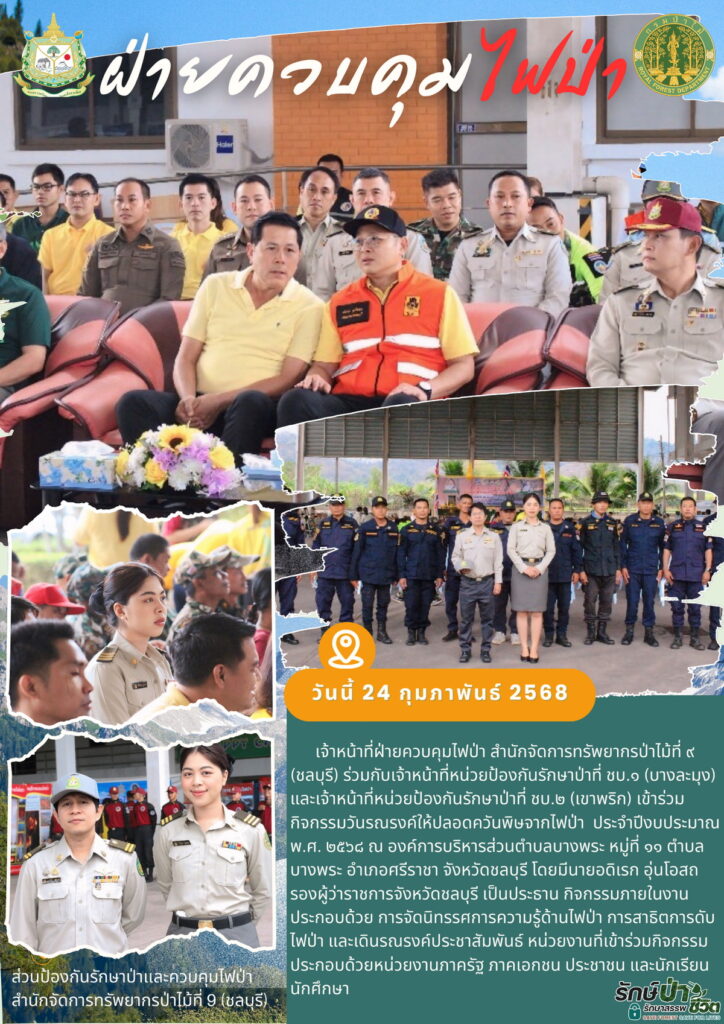 เจ้าหน้าที่ฝ่ายควบคุมไฟป่า สำนักจัดการทรัพยากรป่าไม้ที่ 9 (ชลบุรี) ร่วมกับเจ้าหน้าที่หน่วยป้องกันรักาป่าที่ ชบ.1 (บางละมุง) และเจ้าหน้าที่หน่วยป้องกันรักษาป่าที่ ชบ.2 (เขาพริก) เข้าร่วมกิจกรรมวันรณรงค์ให้ปลอดควันพิษจากไฟป่า ประจำปีงบประมาณ พ.ศ. 2568 ณ องค์การบริหารส่วนตำบลบางพระ หมู่ที่ 11 ตำบลบางพระ อำเภอศรีราชา จังหวัดชลบุรี โดยมีนายอดิเรก อุ่นโอสถ รองผู้ว่าราชการจังหวัดชลบุรี เป็นประธาน กิจกรรมภายในงานประกอบด้วย การจัดนิทรรศการความรู้ด้านไฟป่า การสาธิตการดับไฟป่า และเดินรณรงค์ประชาสัมพันธ์ หน่วยงานที่เข้าร่วมกิจกรรมปรกอบด้วยหน่วยงานภาครัฐ ภาคเอกชน ประชาชน และนักเรียน