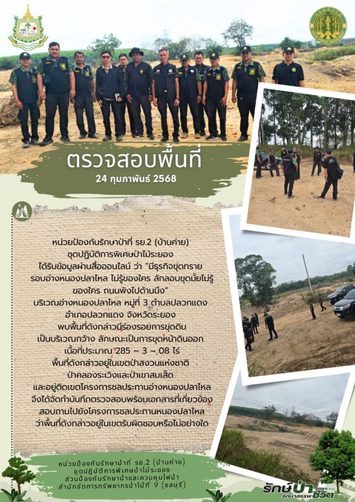 หน่วยป้องกันรักษาป่าที่ รย.2 (บ้านค่าย) ชุดปฏิบัติการพิเศษป่าไม้ระยอง ได้รับข้อมูลผ่านสื่อออนไลน์ ว่า มีธุกิจขุดทรายรอบอ่างหนองปลาไหล ไม่รู้ของใคร ลักลอบขุดมั้ยไม่รู้ของใคร ถนนพังไปด้านนึง บริเวณอ่างหนองปลาไหล หมู่ที่ 3 ตำบลปลวกแดง อำเภอปลวกแดง จังหวัดระยอง พบพื้นที่ดังกล่าวมีร่องรอยการขุดดินเป็นบริเวณกว้าง ลักษณะเป็นการขุดหน้าดินออก เนื้อที่ประมาณ 285-3-08 ไร่ พื้นที่ดังกล่าวอยู่ในเขตป่าสงวนแห่งชาติป่าคลองระเวิงและป่าเขาสมเส็ด และอยู่ติดเขตโครงการชลประทานหนองปลาไหล จึงได้จัดทำบันทึกตรวจสอบพร้อมเอกสารที่เกี่ยวข้องสอบถามไปยังโครงการชลประทานหนองปลาไหลว่าพื้นที่ดังกล่าวอยู่ในเขตรับผิดชอบหรือไม่อย่างไร