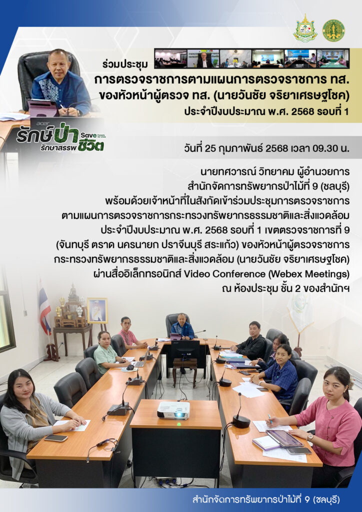 เวลา 09.30 น. นายทศวารณ์ วิทยาคม ผู้อำนวยการสำนักจัดการทรัพยากรป่าไม้ที่ 9 (ชลบุรี) พร้อมด้วยเจ้าหน้าที่ในสังกัดเข้าร่วมประชุมการตรวจราชการตามแผนการตรวจราชการกระทรวงทรัพยากรธรรมชาติและสิ่งแวดล้อม ประจำปีงบประมาณ พ.ศ. 2568 รอบที่ 1 เขตตรวจราชการที่ 9 (จันทบุรี ตราด นครนายก ปราจีนบุรี สระแก้ว) ของหัวหน้าผู้ตรวจราชการกระทรวงทรัพยากรธรรมชาติและสิ่งแวดล้อม (นายวันชัย จริยาเศรษฐโชค) ผ่านสื่ออิเล็กทรอนิกส์ Video Conference (Webex Meetings) ณ ห้องประชุม ชั้น 2 ของสำนักฯ