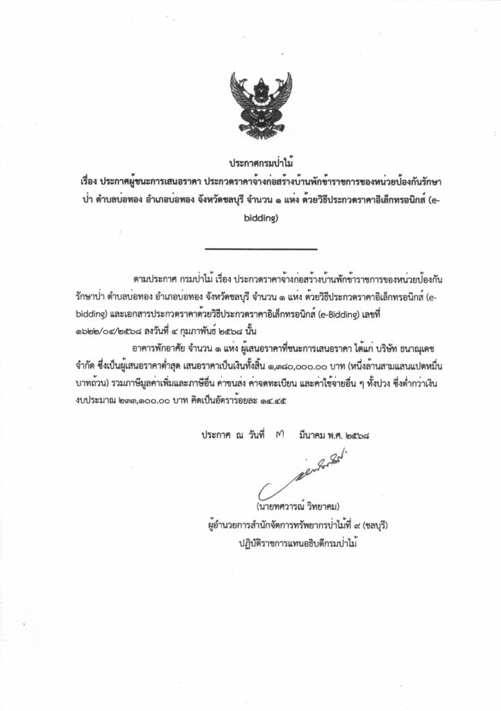 ประกาศกรมป่าไม้ เรื่อง ประกาศผู้ชนะการเสนอราคา ประกวดราคาจ้างก่อสร้างบ้านพักข้าราชการของหน่วยป้องกันรักษาป่า ตำบลบ่อทอง อำเภอบ่อทอง จังหวัดชลบุรี จำนวน 1 แป่ง ด้วยวิธิอิเล็กทรอนิกส์ (e-bidding) เป็นเงินทั้งสิ้น 1,380,000.00 บาท ประกาศ ณ วันที่ 3 มีนาคม พ.ศ. 2568