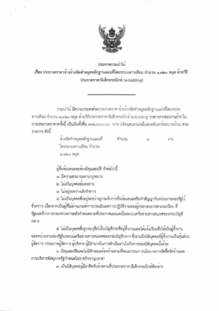 ประกาศกรมป่าไม้ เรื่อง ประกวดราคาจ้างจัดทำหมุดหลักฐานแผนที่โดยระบบดาวเทียม จำนวน 1,320 หมุด ด้วยวิธี ประกวดราคาอิเล็กทรอนิกส์ (e-bidding) ประกาศ ณ วันที่ 17 มีนาคม พ.ศ. 2568
