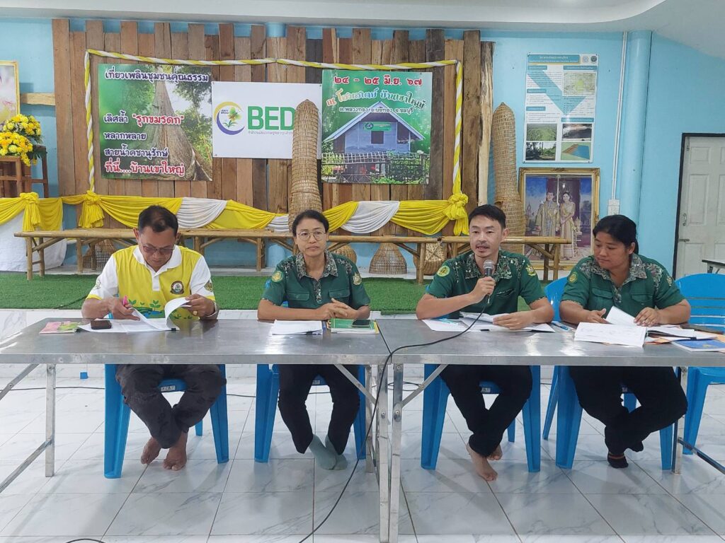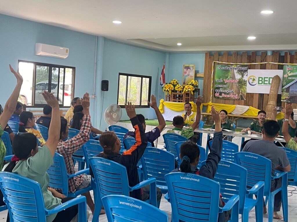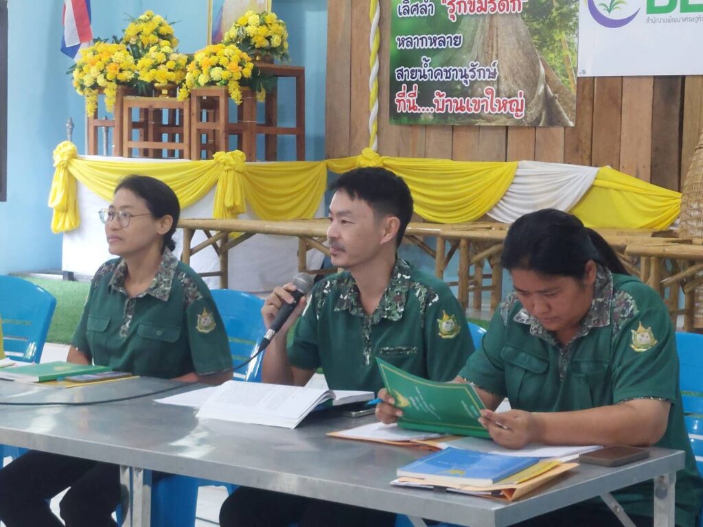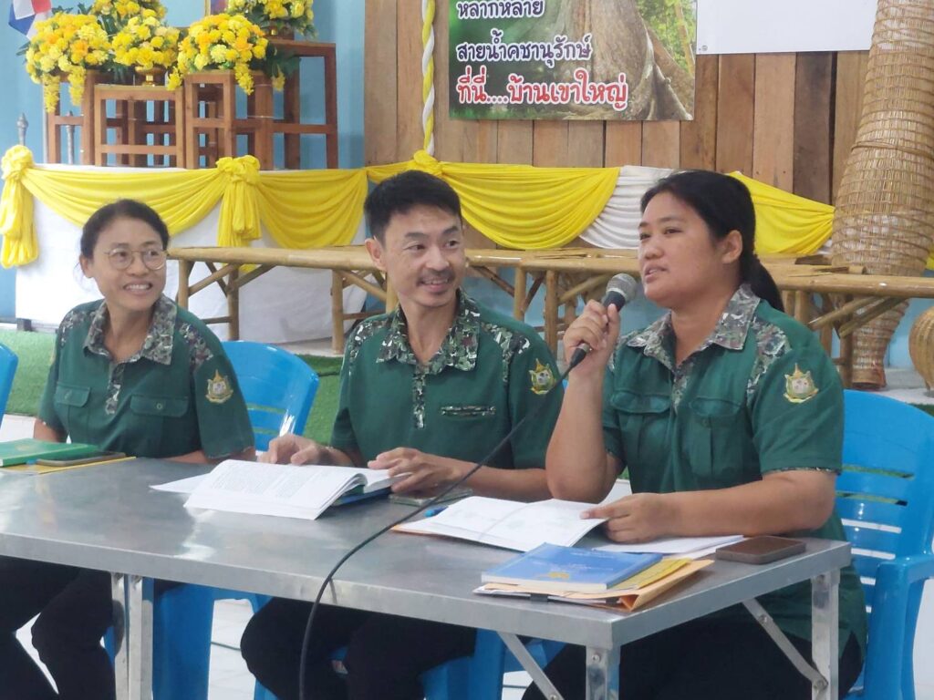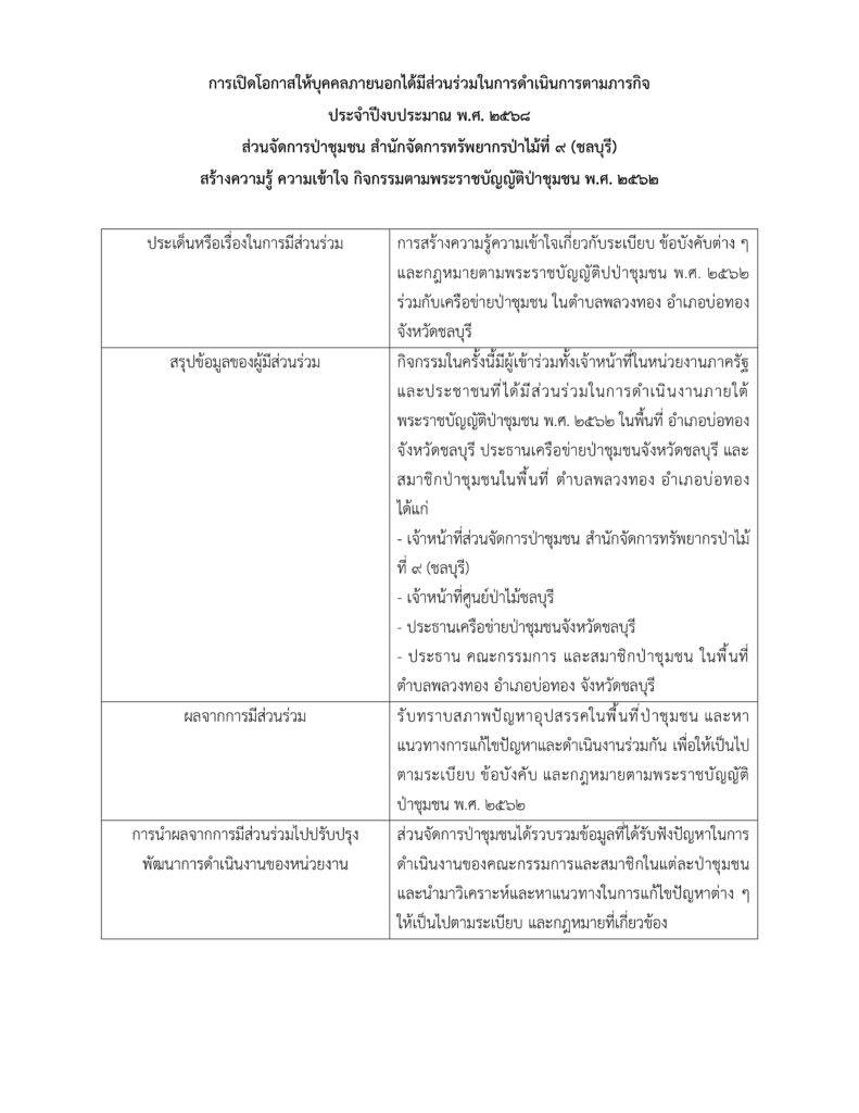 นางสาวปาริชาติ ฤทธิ์เดช ผู้อำนวยการส่วนจัดการป่าชุมชน พร้อมด้วยเจ้าหน้าที่ส่วนจัดการป่าชุมชน ร่วมกับเจ้าหน้าที่ศูนย์ป่าไม้ชลบุรี ดำเนินการสร้างความรู้ ความเข้าใจ กิจกรรมตามพระราชบัญญัติป่าชุมชน พ.ศ. 2562 การดูแลรักษาและการจัดทำทรัพย์สินส่วนกลางของป่าชุมชน ให้กับคณะกรรมการจัดการป่าชุมชนบ้านเขาใหญ่ และเครือข่ายป่าชุมชนอำเภอบ่อทอง ณ ป่าชุมชนบ้านเขาใหญ่ หมู่ที่ 4 ตำบลพลวงทอง อำเภอบ่อทอง จังหวัดชลบุรี