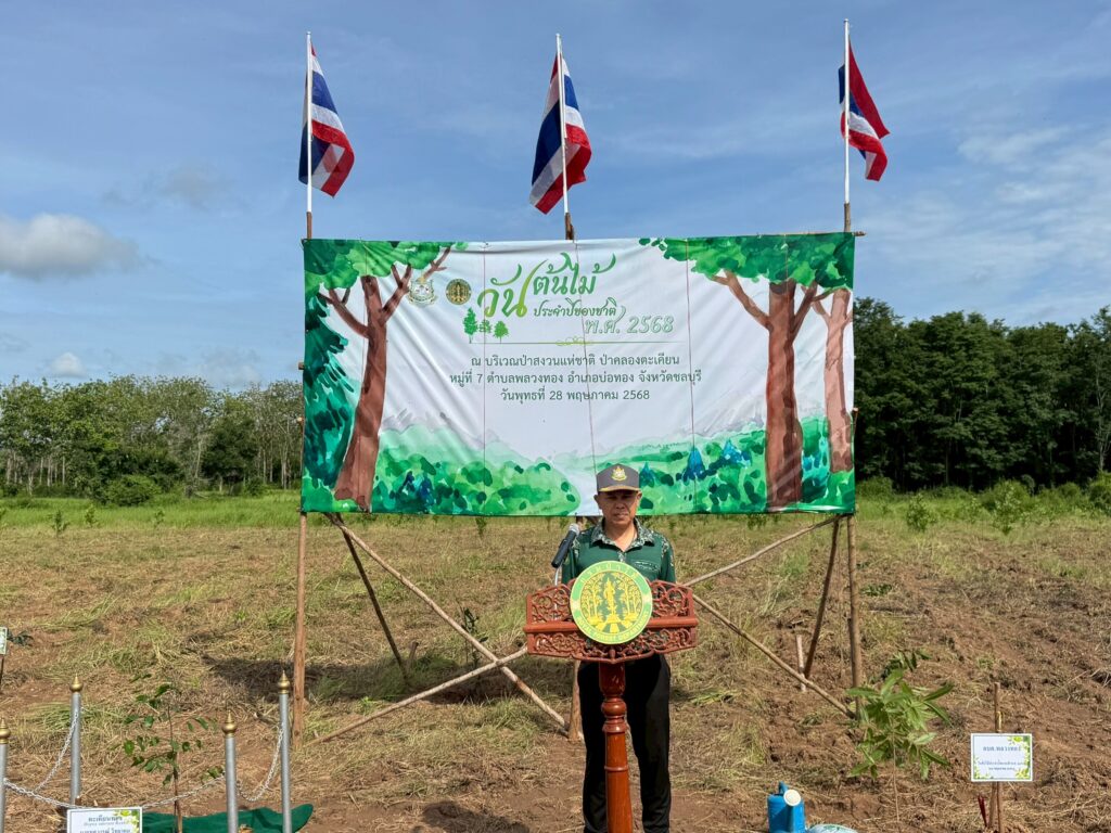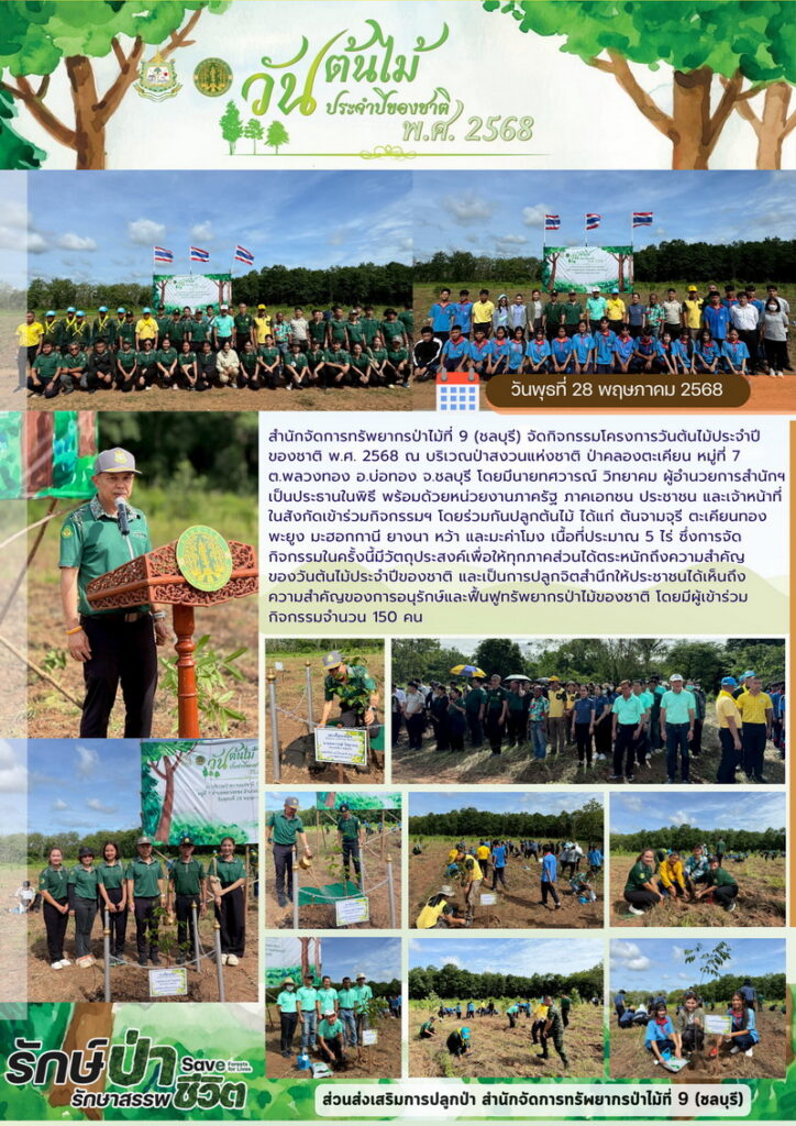 สำนักจัดการทรัพยากรป่าไม้ที่ 9 (ชลบุรี) จัดกิจกรรมโครงการวันต้นไม้ประจำปีของชาติ พ.ศ. 2568 ณ บริเวณป่าสงวนแห่งชาติ ป่าคลองตะเคียน หมู่ที่ 7 ตำบลพลวงทอง อำเภอบ่อทอง จังหวัดชลบุรี โดยมีนายทศวารณ์ วิทยาคม ผู้อำนวยการสำนักฯ เป็นประธานในพิธี พร้อมด้วยหน่วยงานภาครัฐ ภาคเอกชน ประชาชน และเจ้าหน้าที่ในสังกัดเข้าร่วมกิจกรรมฯ โดยร่วมกันปลูกต้นไม้ ได้แก่ ต้นจามจุรี ตะเคียนทอง พะยูง มะฮอกกานี ยางนา หว้า และมะค่าโมง เนื้อที่ประมาณ 5 ไร่ การจัดกิจกรรมในครั้งนี้มีวัตถุประสงค์เพื่อให้ทุกภาคส่วนได้ตระหนักถึงความสำคัญของวันต้นไม้ประจำปีของชาติ และเป็นการปลูกจิตสำนึกให้ประชาชนได้เห็นถึงความสำคัญของการอนุรักษ์และฟื้นฟูทรัพยากรป่าไม้ของชาติ มีผู้เข้าร่วมกิจกรรมจำนวน 150 คน