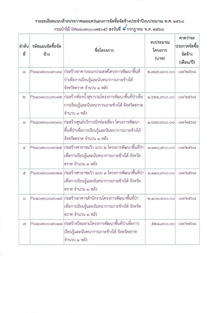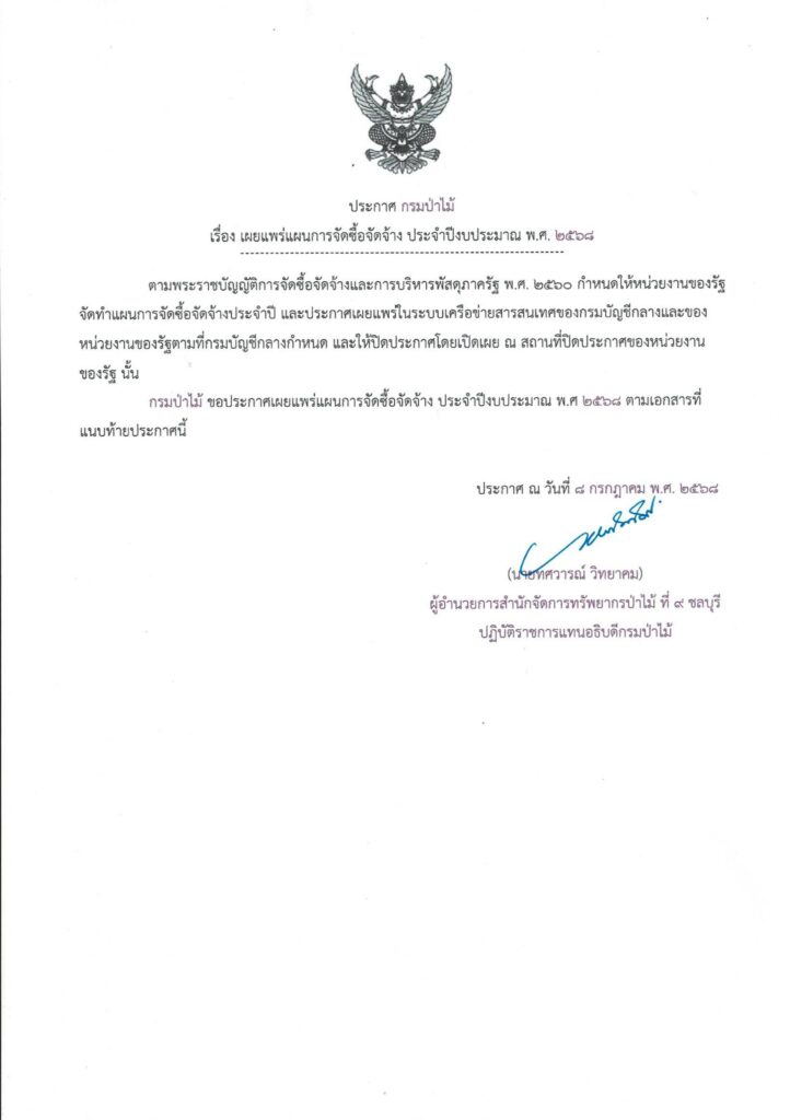 ประกาศกรมป่าไม้ เรื่อง เผยแพร่แผนการจัดซื้อจัดจ้าง ประจำปีงบประมาณ พ.ศ. 2568 ประกาศ ณ วันที่ 8 กรกฎาคม พ.ศ. 2568