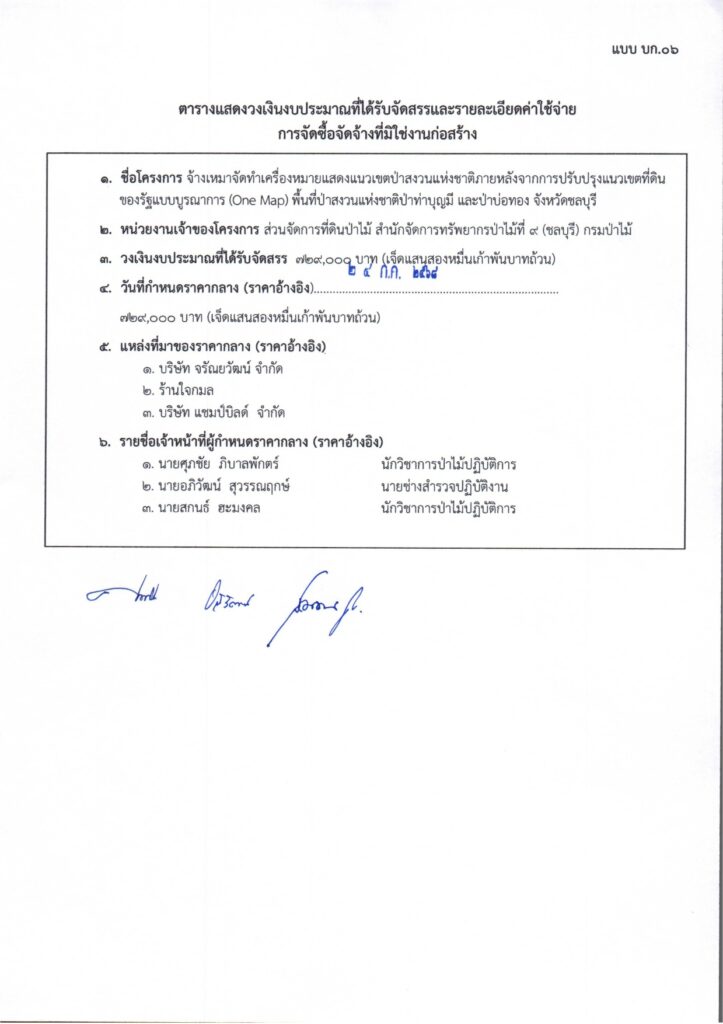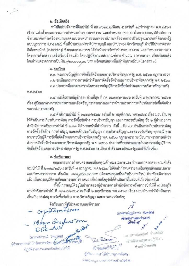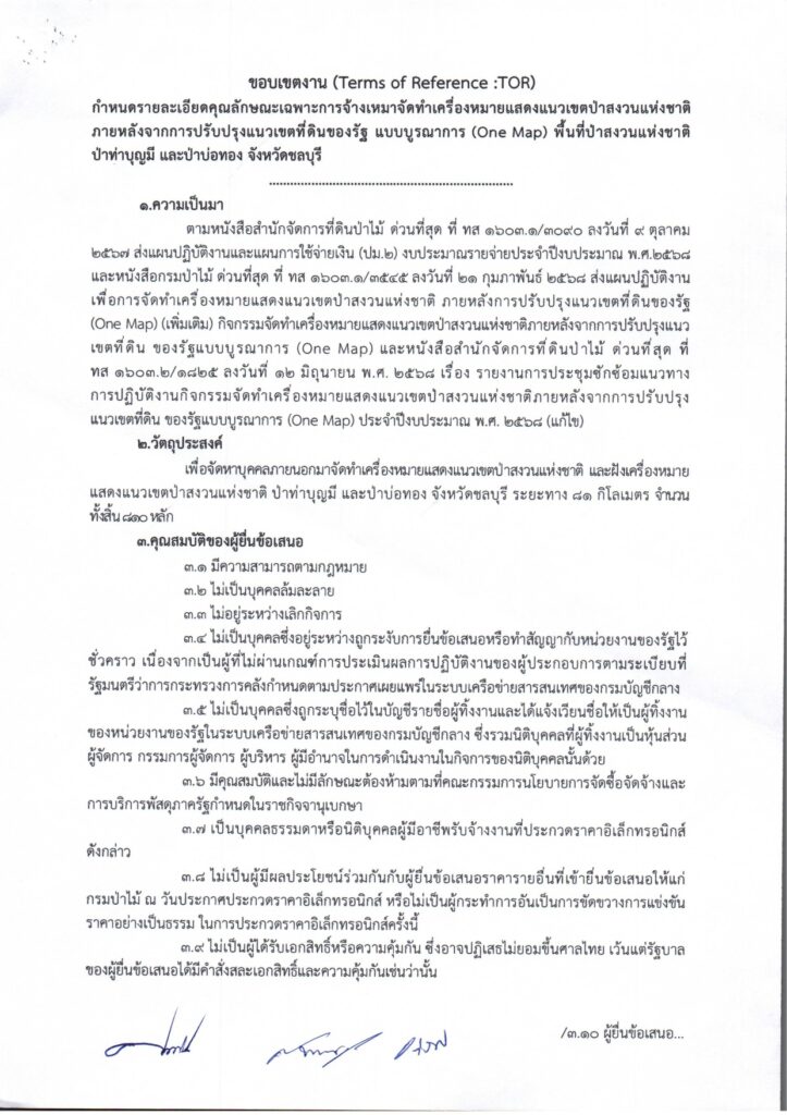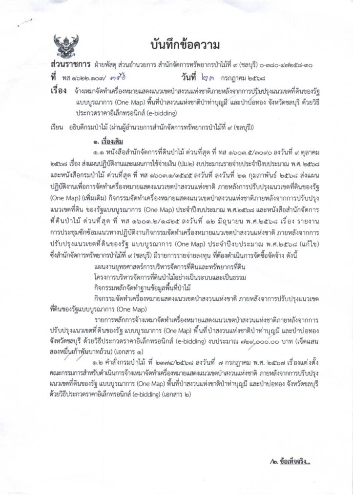 เรื่อง จ้างเหมาจัดทำเครื่องหมายแสดงแนวเขตป่าสงวนแห่งชาติภายหลังจากการปรับปรุงแนวเขตที่ดินของรัฐแบบบูรณาการ (One Map) พื้นที่ป่าสงวนแห่งชาติป่าท่าบุญมี และป่าบ่อทอง จังหวัดชลบุรี ด้วยวิธีประกวดราคาอิเล็กทรอนิกส์ (e-bidding) ประกาศ ณ วันที่ 24 กรกฎาคม พ.ศ. 2568