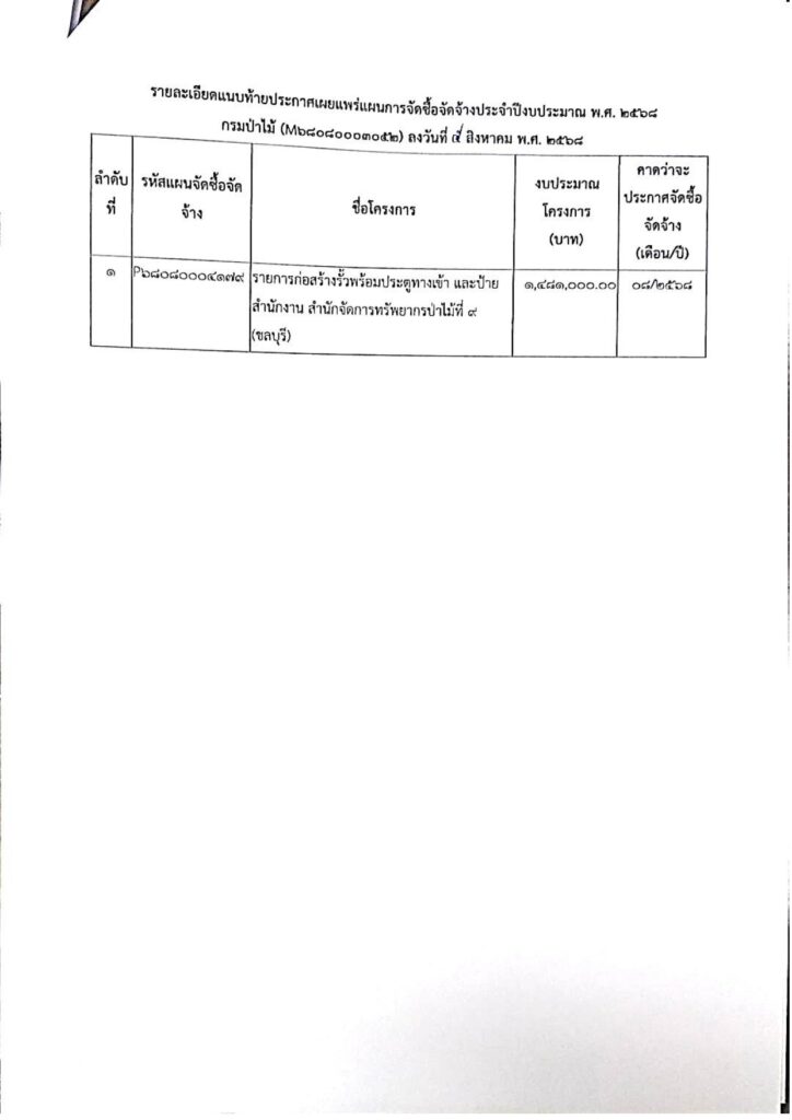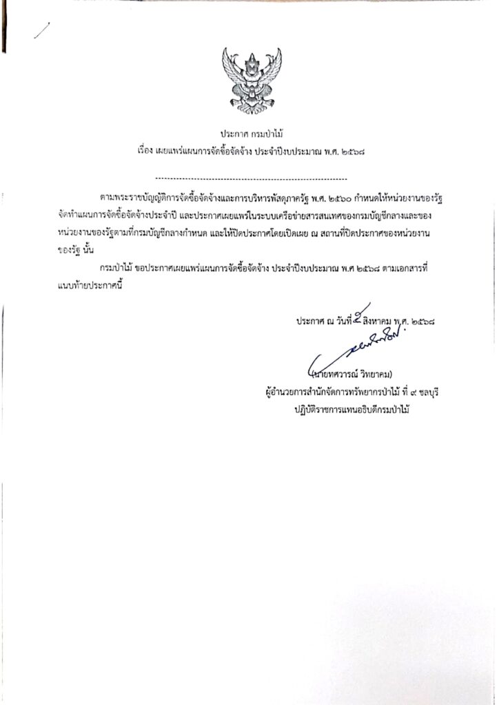 ประกาศกรมป่าไม้ เรื่อง เผยแพร่แผนการจัดซื้อจัดจ้าง ประจำงบประมาณ พ.ศ. 2568 ประกาศ ณ วันที่ 5 สิงหาคม พ.ศ. 2568