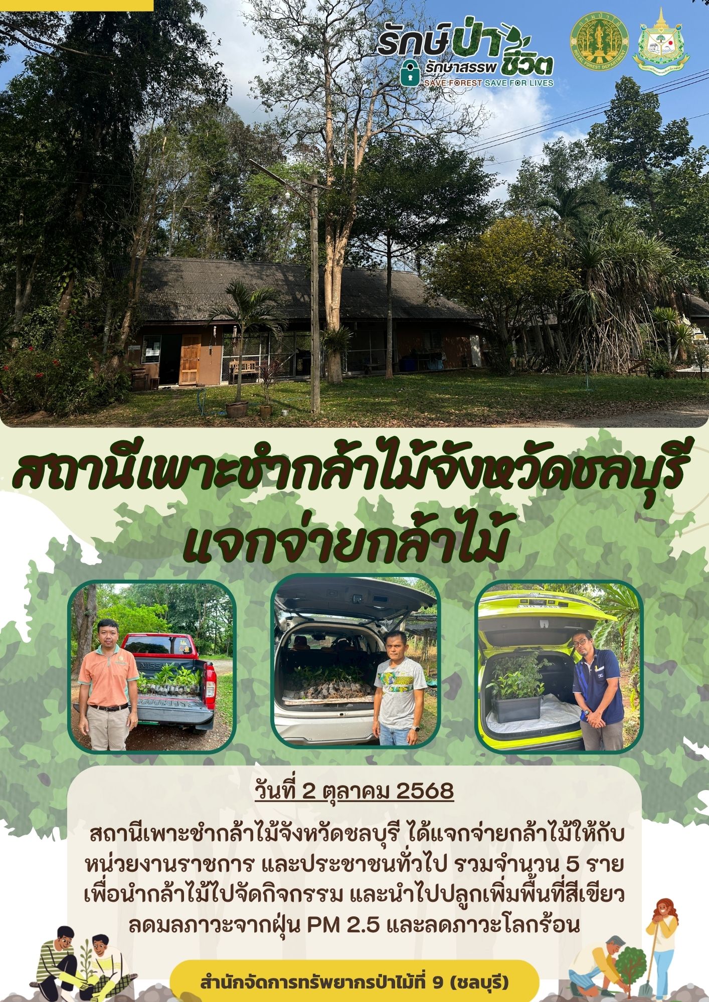 สถานีเพาะชำกล้าไม้จังหวัดชลบุรี ได้แจกจ่ายกล้าไม้ให้กับหน่วยงานราชการ และประชาชนทั่วไป รวมจำนวน 5 ราย เพื่อนำกล้าไม้ไปจัดกิจกรรม และนำไปปลูกเพิ่มพื้นที่สีเขียว ลดมลภาวะจากฝุ่น PM 2.5 และลดภาวะโลกร้อน