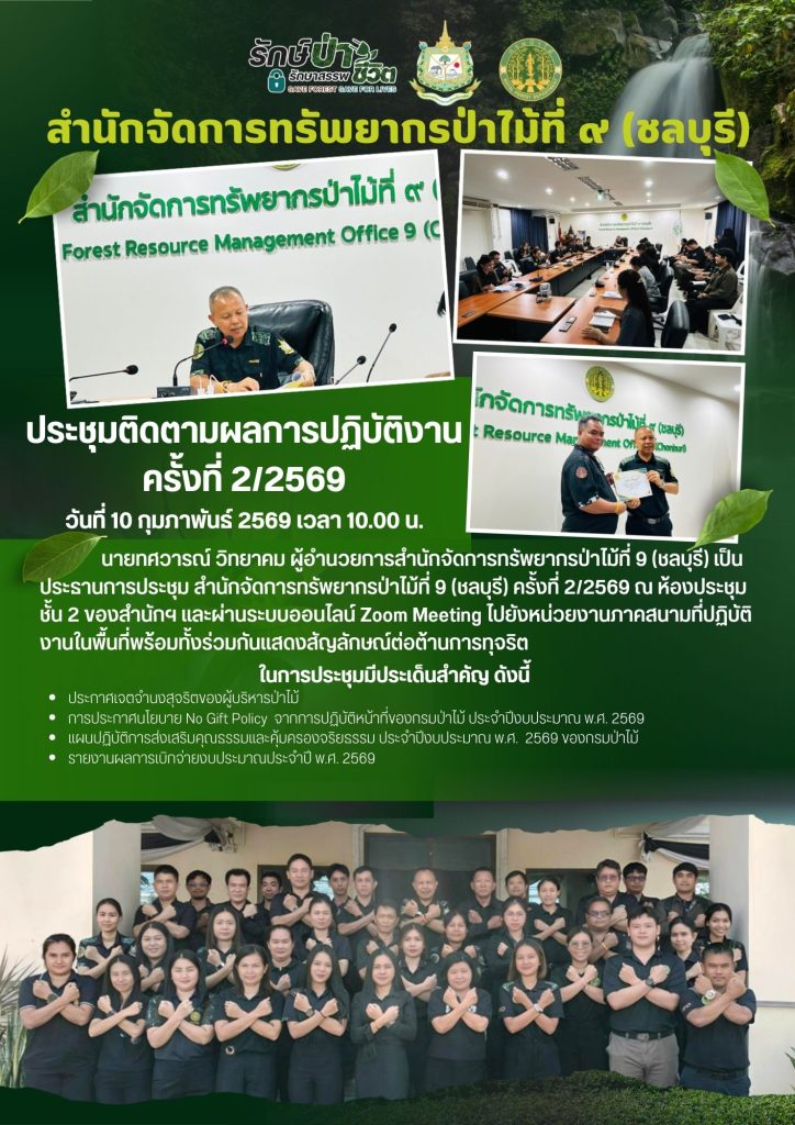 นายทศวานณ์ วิทยาคม ผู้อำนวยการสำนักจัดการทรัพยากรป่าไม้ที่ 9 (ชลบุรี) เป็นประธานการประชุม สำนักจัดการทรัพยากรป่าไม้ที่ 9 (ชลบุรี) ครั้งที่ 2/2569 ณ ห้องประชุม ชั้น 2 ของสำนักฯ และผ่านระบบออนไลน์ Zoom Meeting ไปยังหน่วยงานภาคสนามที่ปฏิบัติงานในพื้นที่ พร้อมทั้งร่วมกันแสดงสัญลักษณ์ต่อต้านการทุจริต