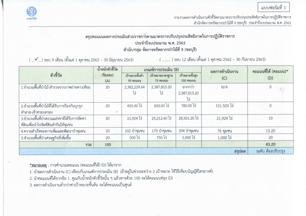 รายงานผลการดำเนินงานตัวชี้วัดตามมาตรการปรับปรุงประสิทธิภาพในการปฏิบัติราชการ ประจำปีงบประมาณ พ.ศ. 2563 ของสำนักจัดการทรัพยากรป่าไม้ที่ 9 (ชลบุรี) – สรุปคะแนนผลการประเมินส่วนราชการตามมาตรการปรับปรุงประสิทธิภาพในการปฏิบัติราชการ ประจำปีงบประมาณ พ.ศ. 2563 ของสำนักจัดการทรัพยากรป่าไม้ที่ 9 (ชลบุรี)