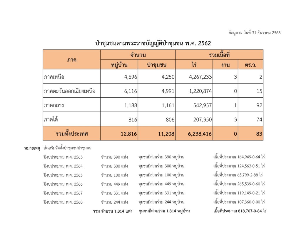 ป่าชุมชนชุมชนตามพระราชบัญญัติป่าชุมชน พ.ศ. 2562 (ข้อมูล ณ วันที่ 31 ธันวาคม 2568)