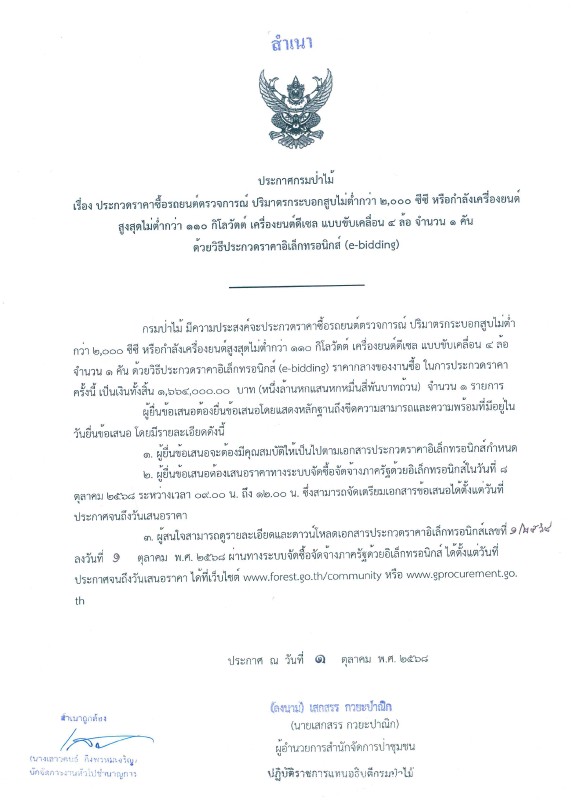 ประกวดราคาซื้อรถยนต์ตรวจการณ์ ปริมาตรกระบอกสูบไม่ต่ำกว่า ๒,๐๐๐ ซีซี หรือกำลังเครื่องยนต์สูงสุดไม่ต่ำกว่า ๑๑๐ กิโลวัตต์ เครื่องยนต์ดีเซล แบบขับเคลื่อน ๔ ล้อ จำนวน ๑ คัน