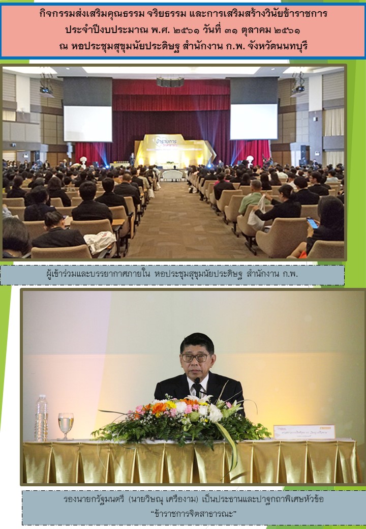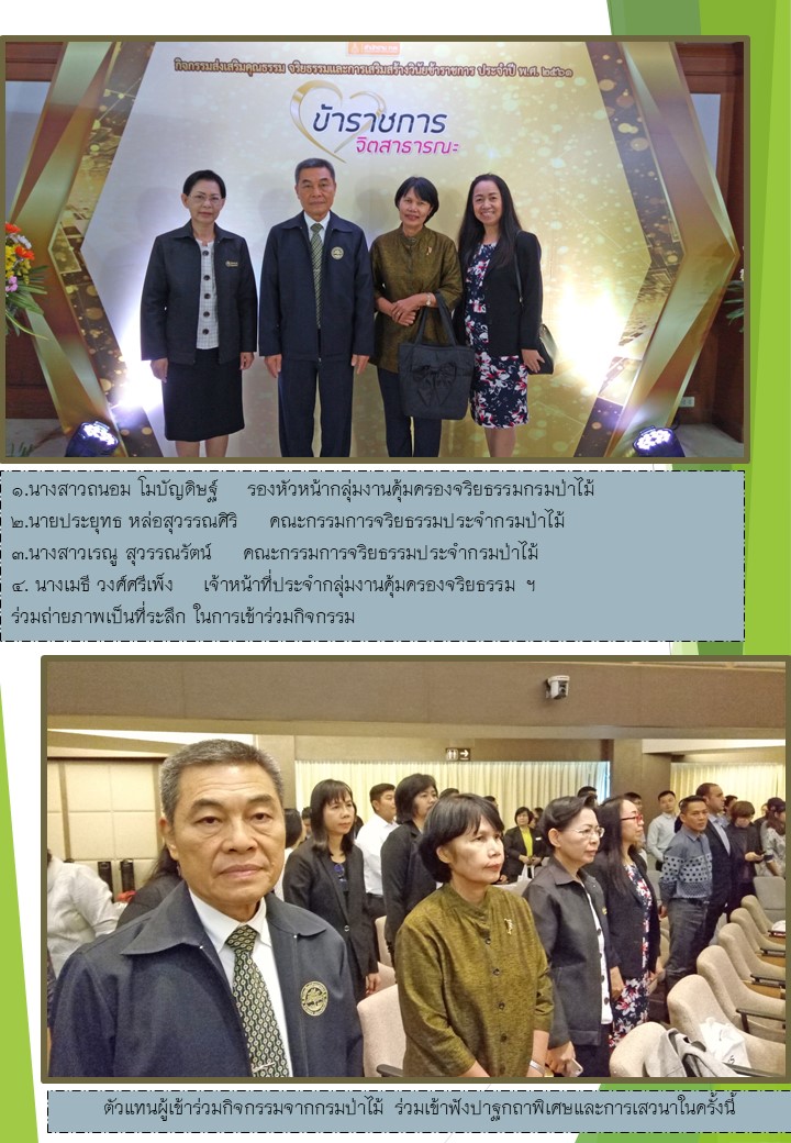 วันพุธที่ ๓๑ ตุลาคม ๒๕๖๑ นางสาวถนอม โมบัญดิษฐ์ รองหัวหน้ากลุ่มงานคุ้มครองจริยธรรมกรมป่าไม้ พร้อมด้วยนายประยุทธ หล่อสุวรรณศิริ,นางสาวเรณู สุวรรณรัตน์ คณะกรรมการจริยธรรมประจำกรมป่าไม้ และเจ้าหน้าที่ประจำกลุ่มงานคุ้มครองจริยธรรมฯ ได้รับมอบหมายให้เข้าร่วมกิจกรรมส่งเสริมคุณธรรม จริยธรรม และการเสริมสร้างวินัยข้าราชการ ประจำปีงบประมาณ พ.ศ.๒๕๖๑ ณ หอประชุมสุขุมนัยประดิษฐ สำนักงาน ก.พ. จังหวัดนนทบุรี โดยมีรองนายกรัฐมนตรี (นายวิษณุ เครืองาม) เป็นประธานและปาฐกถาพิเศษ หัวข้อ “ข้าราชการจิตสาธารณะ”
