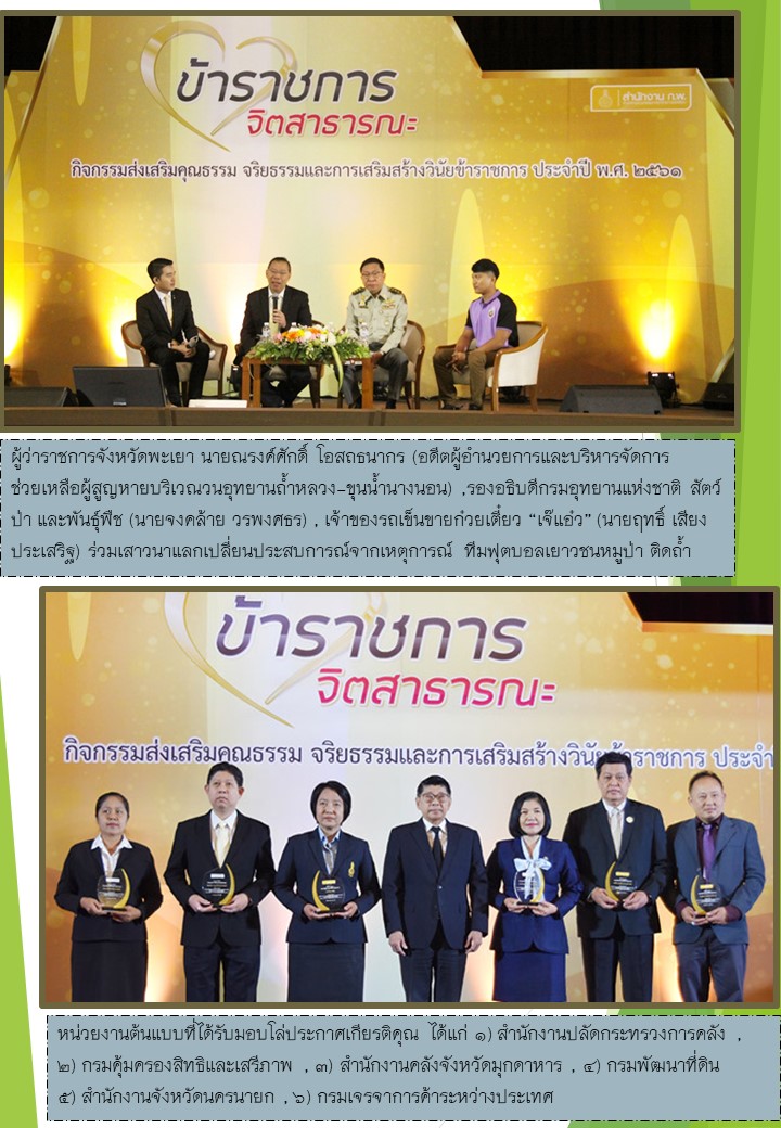 >>>>>ในงานยังมีการเสวนาแลกเปลี่ยนประสบการณ์ในการมี “จิตสาธารณะ” กรณีการร่วมมือกันระหว่างภาครัฐและเอกชนเพื่อช่วยเหลือ “ทีมฟุตบอลเยาวชนหมู่ป่า” ที่ติดในถ้ำหลวงขุนน้ำนางนอน จังหวัดเชียงราย โดยเชิญผู้ว่าราชการจังหวัดพะเยา นายณรงค์ศักดิ์ โอสถธนากร (อดีตผู้อำนวยการและบริหารจัดการช่วยเหลือผู้สูญหายบริเวณวนอุทยานถ้ำหลวง-ขุนน้ำนางนอน) , รองอธิบดีกรมอุทยานแห่งชาติฯ (นายจงคล้าย วรพงศธร) และเจ้าของรถเข็นขายก๋วยเตี๋ยว “เจ๊แอ๋ว” (นายฤทธิ์ เสียงประเสริฐ) เข้าร่วมเสวนาในครั้งนี้