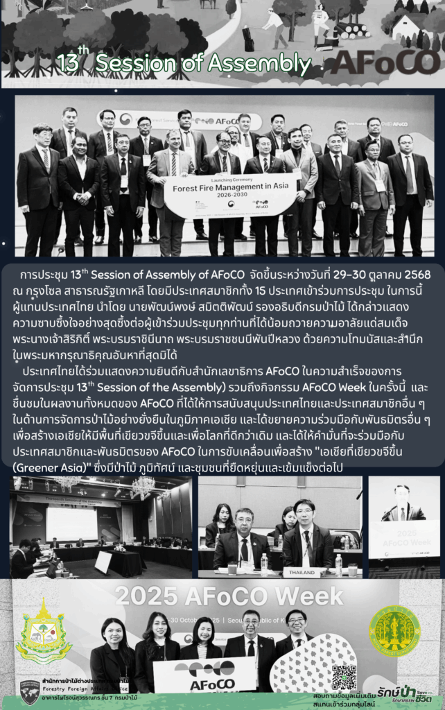 วันที่ 29 ตุลาคม 2568 นายพัฒน์พงษ์ สมิตติพัฒน์ รองอธิบดีกรมป่าไม้ พร้อมด้วย นายมนตรี อินต๊ะเสน นักวิชาการป่าไม้ชำนาญการพิเศษ สำนักการป่าไม้ต่างประเทศและนางสาวสินีนิษฐ์ งิ้ววิจิตร นักวิเคราะห์นโยบายและแผนปฏิบัติการ สำนักแผนงานและสารสนเทศ เข้าร่วมการประชุม 13th Session of Assembly of AFoCO ซึ่งจัดขึ้นระหว่างวันที่ 29-30 ตุลาคม 2568 ณ กรุงโซล สาธารณรัฐเกาหลี โดยมีประเทศสมาชิกทั้ง 15 ประเทศเข้าร่วมการประชุม ในการนี้ ผู้แทนประเทศไทย นำโดย นายพัฒน์พงษ์ สมิตติพัฒน์ รองอธิบดีกรมป่าไม้ ได้กล่าวแสดงความซาบซึ้งใจอย่างสุดซึ้งต่ออผู้เข้าร่วมประชุมทุกท่านที่ได้น้อมถวายความอาลัยแด่สมเด็จพระนางเจ้าสิริกิติ์ พระบรมราชินีนาถ พระบรมราชชนนีพันปีหลวง ด้วยความโทมนัสและสำนึกในพระมหากรุณาธิคุณอันหาที่สุดมิได้