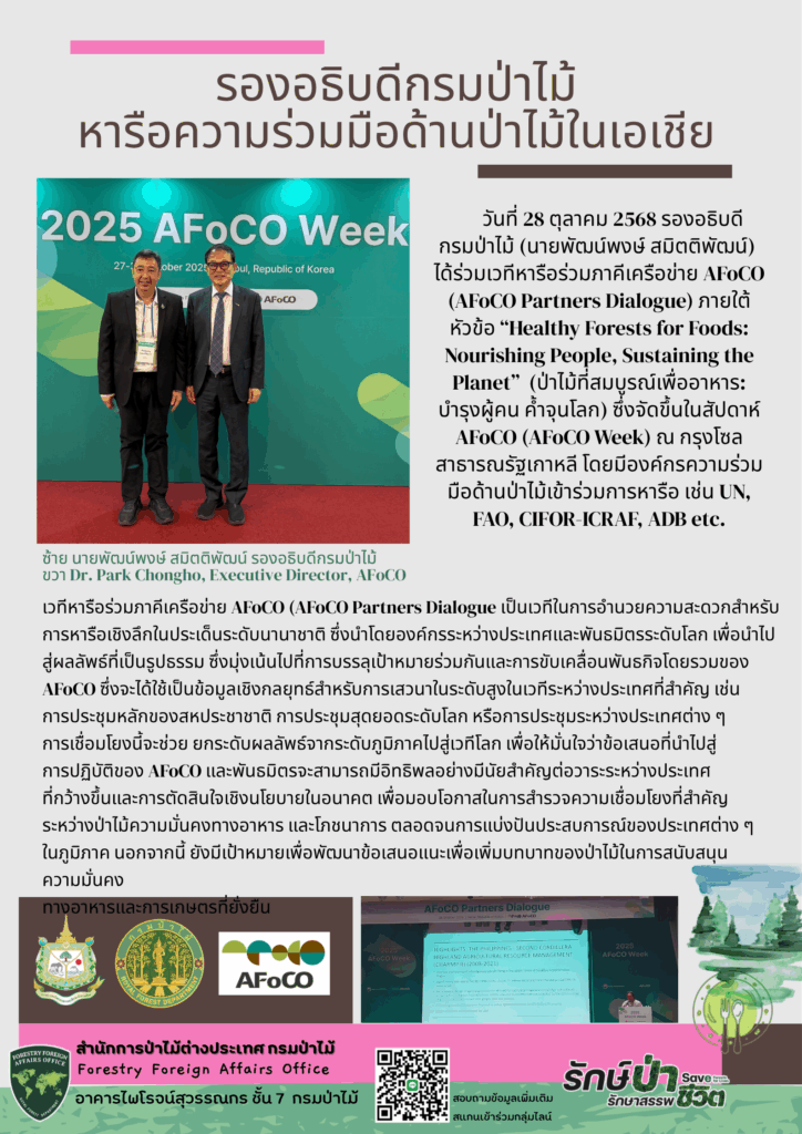 วันที่ 28 ตุลาคม 2568 เวทีหารือร่วมภาคีเครือข่าย AFoCO (AFoCO Partners Dialogue) ภายใต้หัวข้อ “Healthy Forests for Foods: Nourishing People, Sustaining the Planet” (ป่าไม้ที่สมบูรณ์เพื่ออาหาร: บำรุงผู้คน ค้ำจุนโลก)